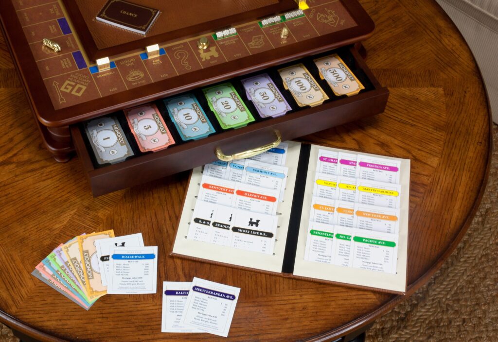 There are faux leather-wrapped title deed card holders, premium cards, and money and the tangible sense of quality to each of the board game’s components really will elevate the experience of playing to a whole new level of enjoyment. Last but not least, there are two elegant bank-teller-style money trays and drawers.