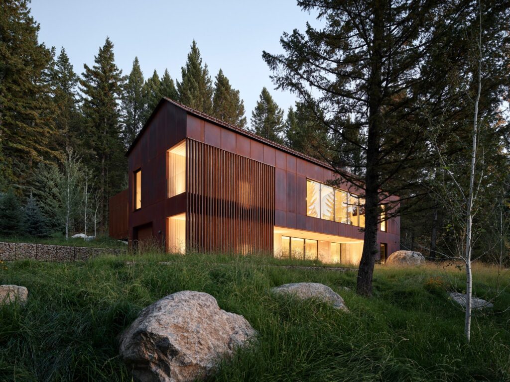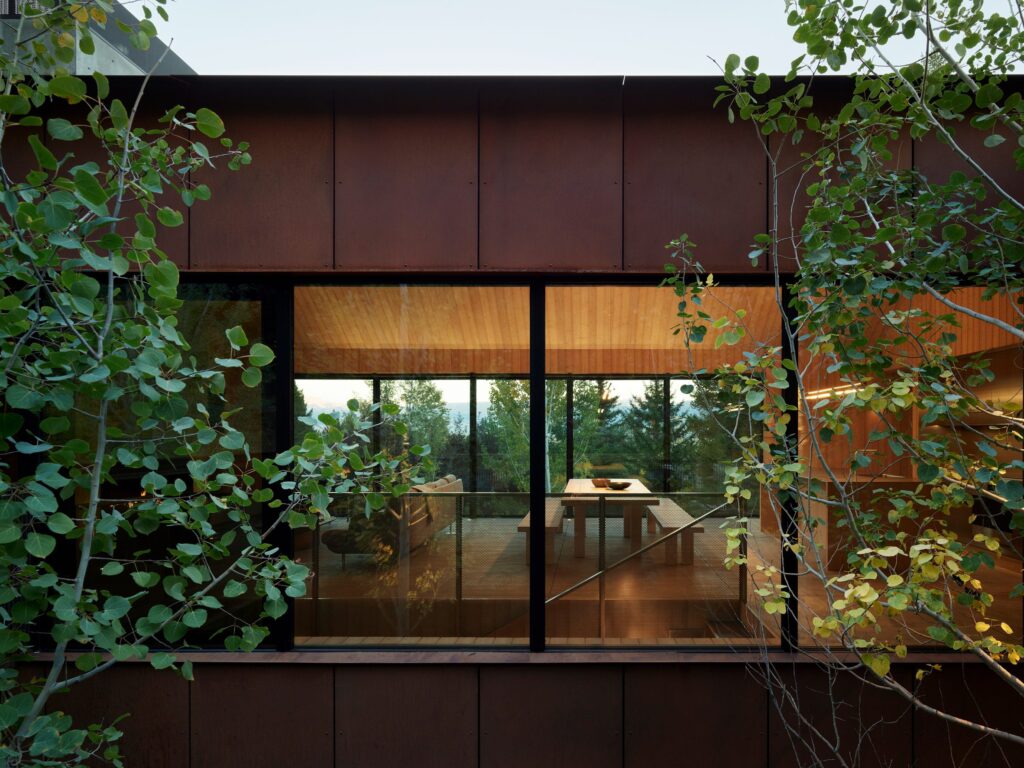 Much like the shell of a cashew, the weathering steel develops a rich, oxidized patina over time, echoing the rugged textures of the surrounding mountains and the sunset hues of the valley. It’s a bold material choice that feels entirely at home in a climate known for its unforgiving winters and baking summers.