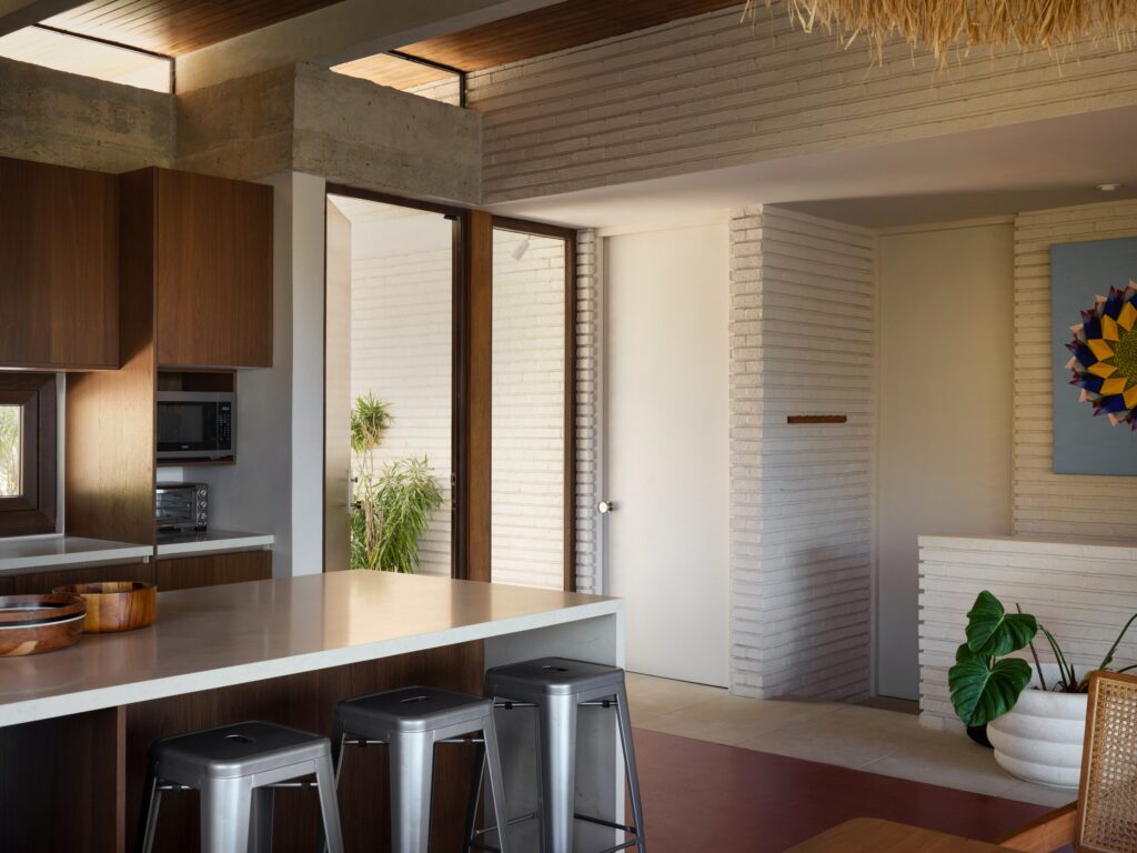 Acting as a striking visual anchor, a central white brick volume elegantly offsets the rich, dark tones of the timber. This crisp brickwork perfectly complements the home’s exposed concrete columns, beams, and walls, which inject a profound sense of industrial “strength and simplicity” into the tropical aesthetic.