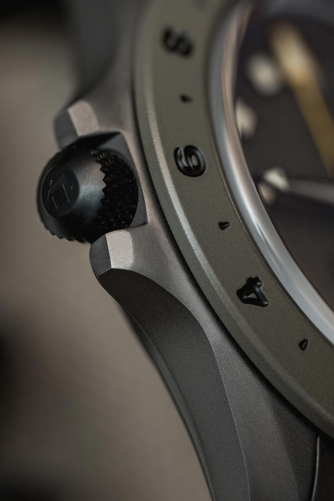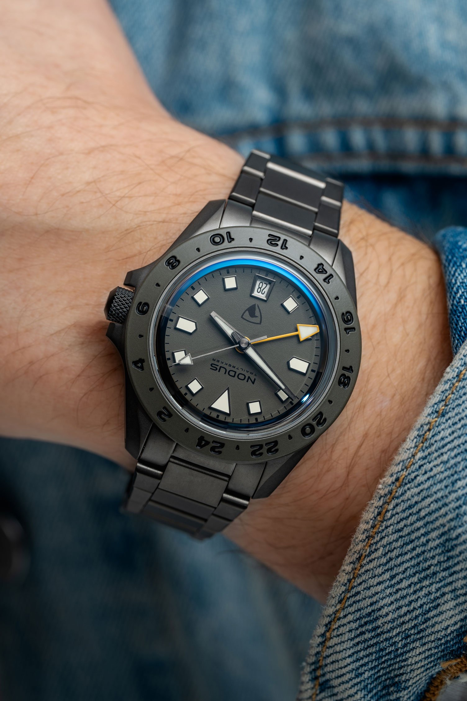 Project TrailTrekker introduces an innovative watch design featuring the Miyota 9075 GMT movement, which boasts an hour hand that can be adjusted independently. The entire watch is encased in a gunmetal grey DLC (GDLC) coating, offering scratch resistance and a robust look. For added protection, both the bezel and dial are coated with Cerakote®, a durable ceramic layer commonly utilized in military, aerospace, and automotive industries. Completing the design are 3D-chamfered gunmetal hands and indices, enhancing the watch’s overall appeal.