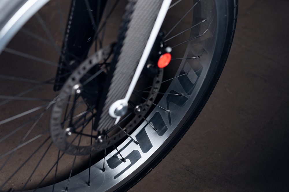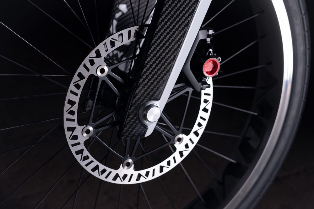 Everywhere you look with the Novus Electric Motorcycle you will see an exemplary design feature which really points to its compelling performance out on the road. It has carbon fibre brake levers which are actuated, the ultra-light monoblock calipers grip the 230 mm brake discs and the floating brake discs ensure optimal braking performance even under high loads.
