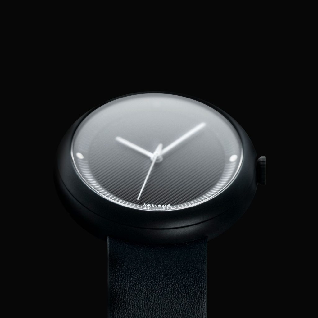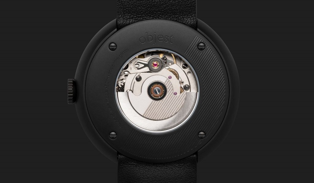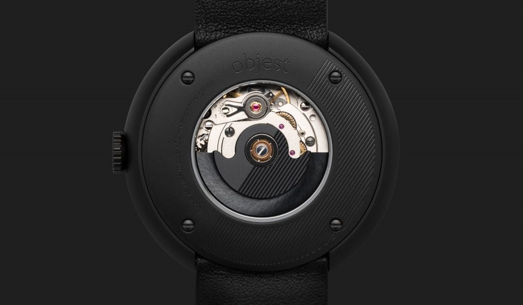 The Objest Watches on Kickstarter (£325) are fitted with scratch-resistant sapphire glass for optimal clarity and protection. Hour markers at 3,6,9,12 sit below and surface and are polished, with small dots showing off the indices in between. Thin controlled lines are printed on the concave surface of the dial which deliver a graphical pattern, while still being functional. The hands come in a contrasting matte colour, with the seconds hand featuring Objest’s signature reverse teardrop design.