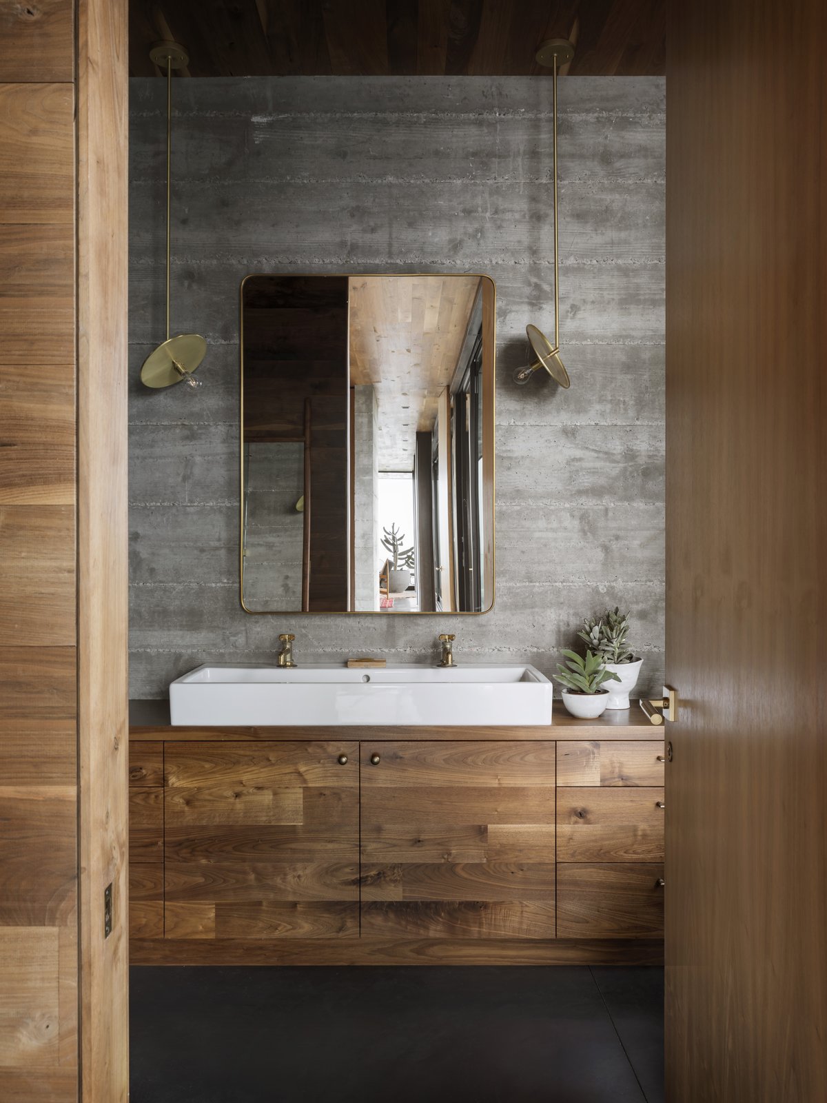 A lot of thought clearly went into the choice of materials used in the Off-Grid Guesthouse. Its designers strived to craft it from an array of materials that would wear and take on a patina over time, in order that they would start to look and feel like part of the landscape that surrounds it. This included materials such as unfinished steel, board-formed concrete, and glass on the outside and when you head within, you’ll find a lot of rich black walnut – which was deployed for ceilings, cabinetry, and furniture—and delivers a compelling contrast.