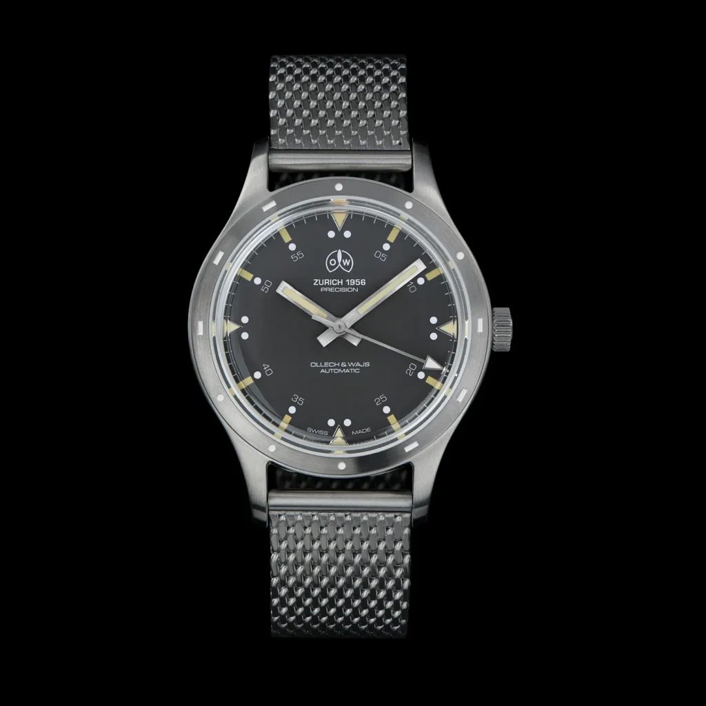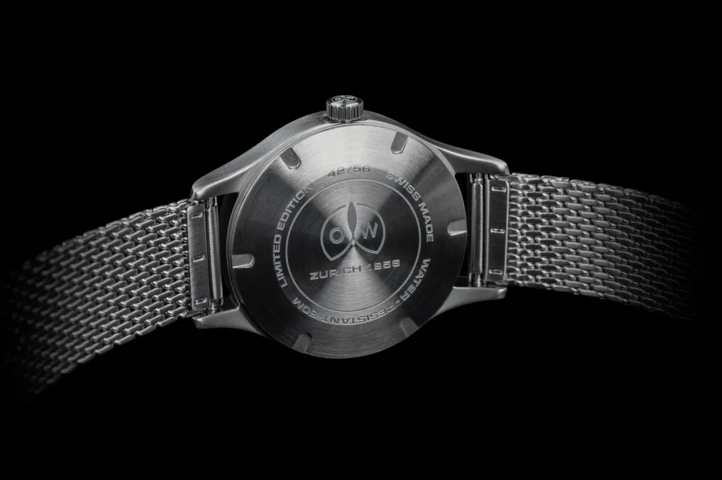 The Ollech & Wajs 56 M is a watch that is both inspired by history and a piece of history itself. It combines vintage new old stock parts with contemporary parts, creating a unique and timeless timepiece. The 38mm case is upcycled from unused stock that was originally acquired by Ollech & Wajs in the late 90s. This stock was manufactured several years earlier, and its classic silhouette is a throwback to the military pilot watches of the late 1940s. Collectors of vintage OW will recognize it from historic models such as the Valjoux 7733 Flieger and the MP series.