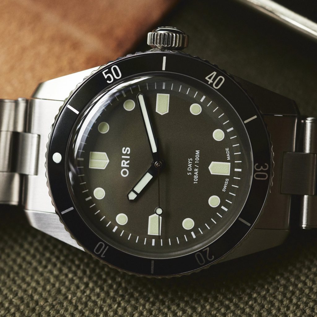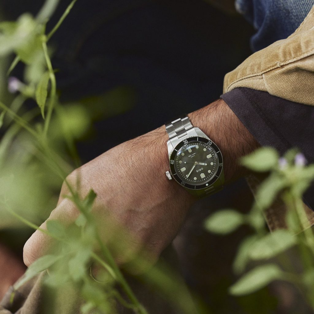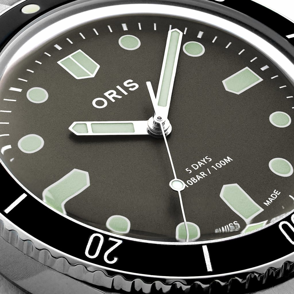 For the first time at Oris, the Divers Sixty-Five comes equipped with a countdown bezel. HODINKEE decided to drop the date window on the forest green dial – a hue that is influenced by both the pastoral landscape of Oris’ hometown of Hölstein, Switzerland and the verdant terrain of upstate New York – adding in hour markers on the cardinal points of the dial in the shape of the shields that once appeared on the company’s logo. The Oris signature on the dial is blocky and bold-faced – something which acts as somewhat of a departure from the watchmaker’s modern branding and one that more closely resembles the stamp placed on Oris dive watches in the 60s.