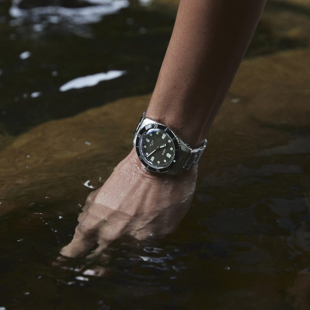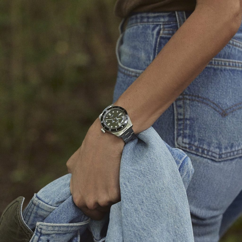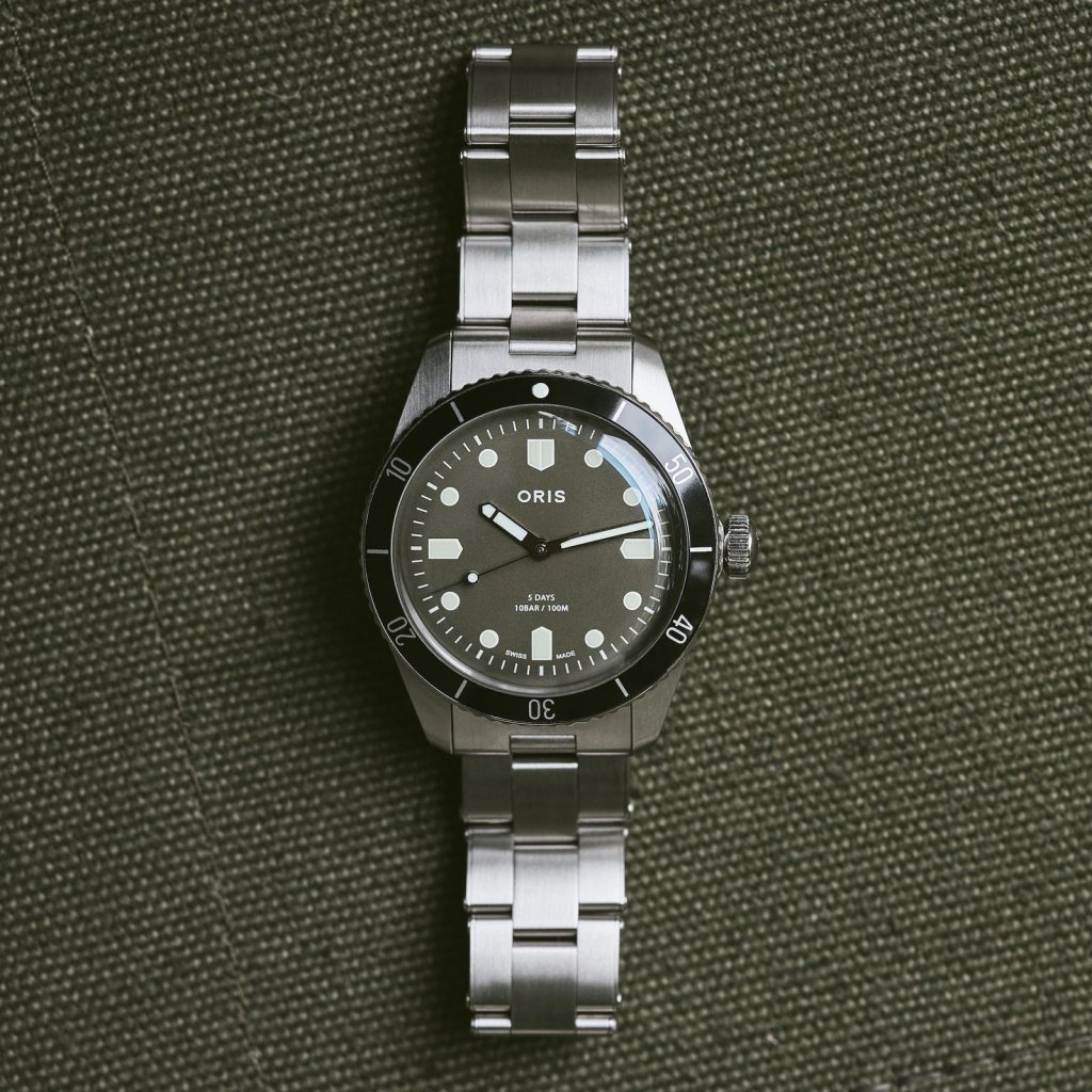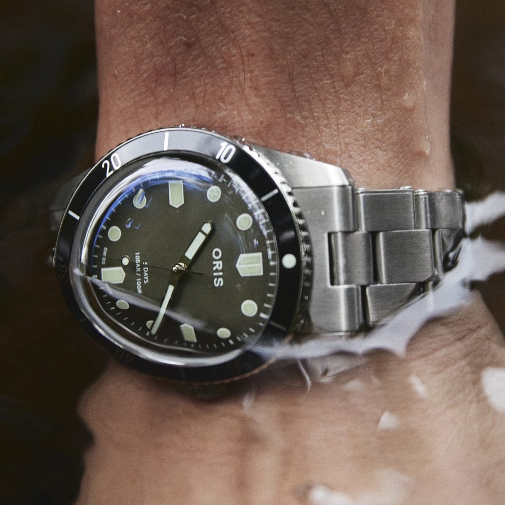 For the first time at Oris, the Divers Sixty-Five comes equipped with a countdown bezel. HODINKEE decided to drop the date window on the forest green dial – a hue that is influenced by both the pastoral landscape of Oris’ hometown of Hölstein, Switzerland and the verdant terrain of upstate New York – adding in hour markers on the cardinal points of the dial in the shape of the shields that once appeared on the company’s logo. The Oris signature on the dial is blocky and bold-faced – something which acts as somewhat of a departure from the watchmaker’s modern branding and one that more closely resembles the stamp placed on Oris dive watches in the 60s.