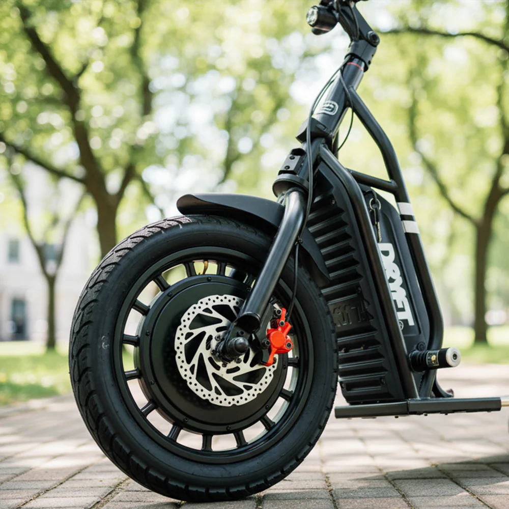 Most e-scooters are limited by their small wheels, which restrict the size of the brake rotors. The Dryft Board sidesteps this entirely by utilizing a full-size 16-inch front wheel, allowing for the integration of full-size MTB-BMX hydraulic disc brakes complete with a Tektro Hydraulic caliper.