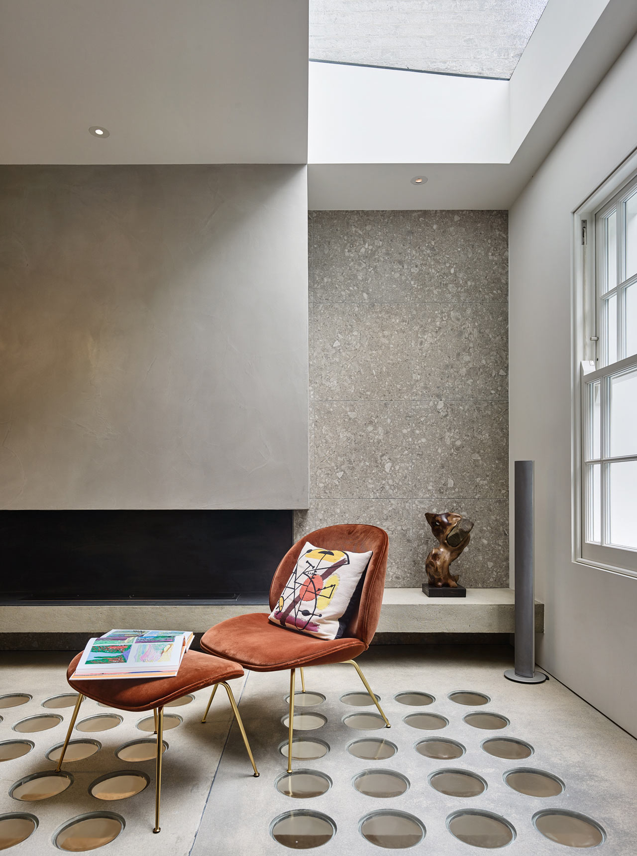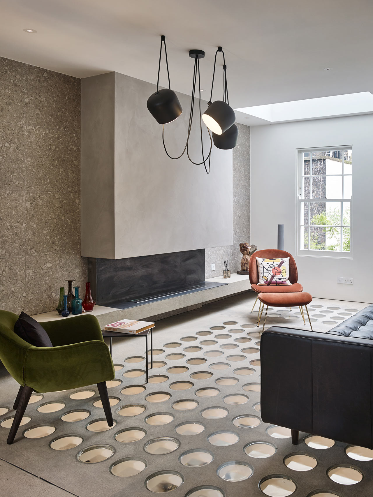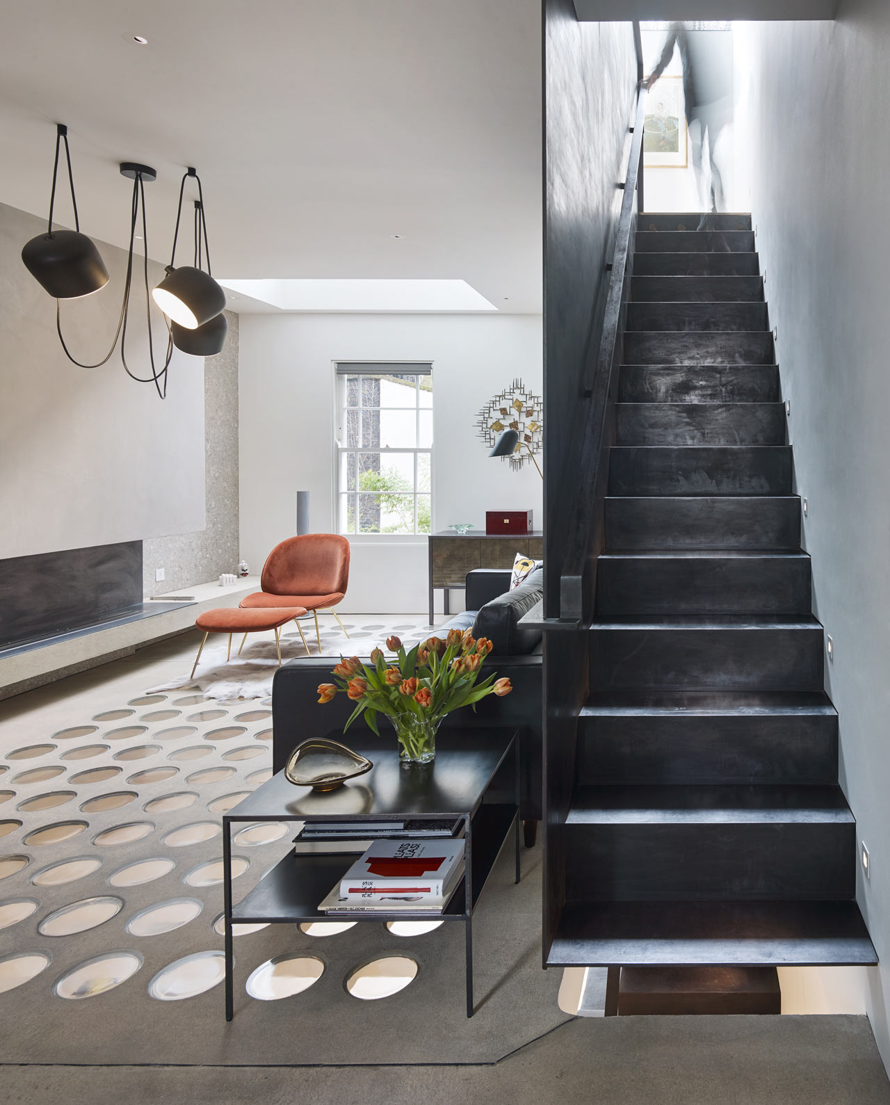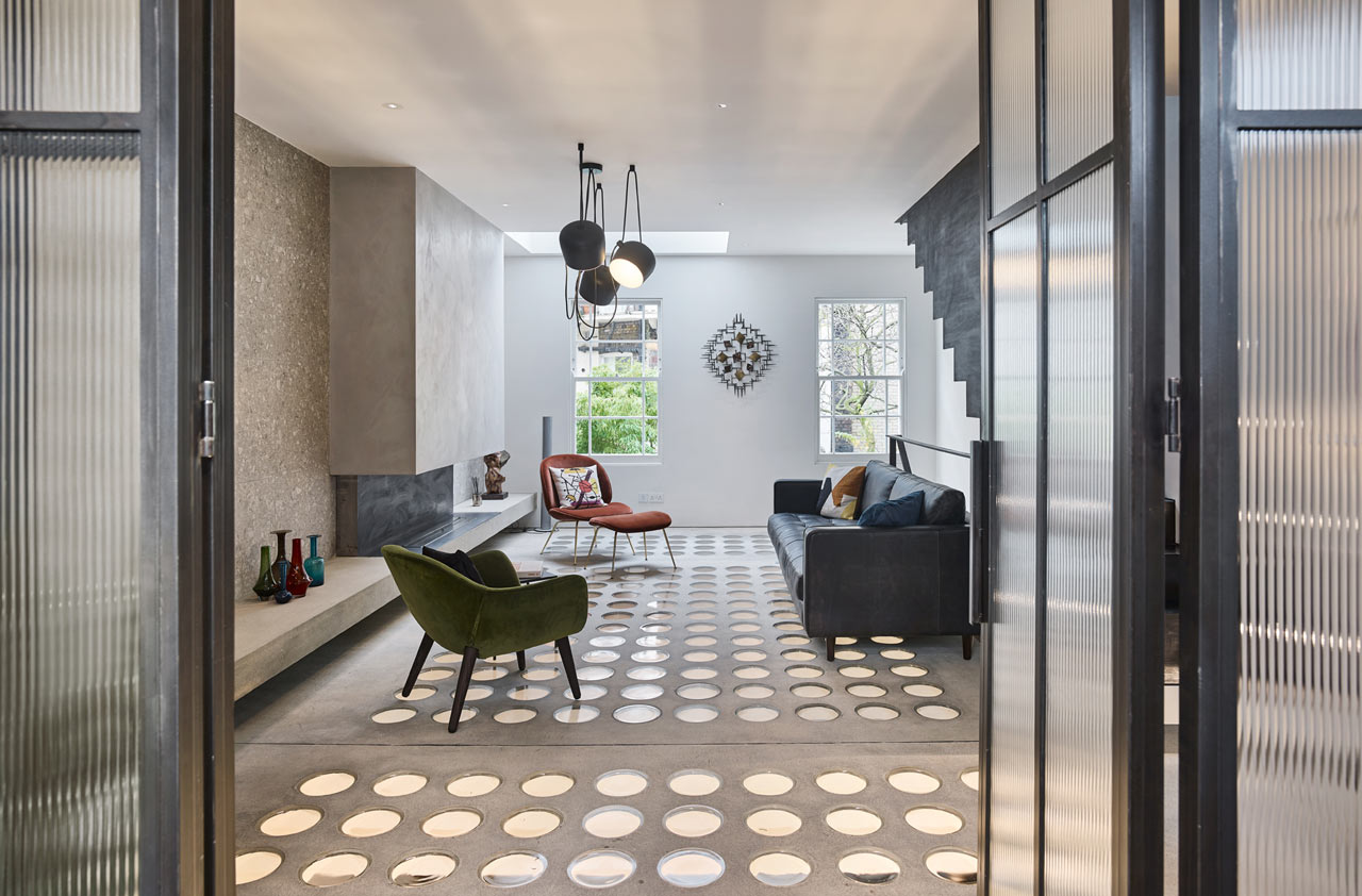 The Perf House by Andy Martin Architects makes use of a restrained palette of industrial materials – which included raw concrete and blackened steel – and combines this with refined glass, timber and carefully detailed plasterwork to deliver a relaxing but crisp interior that is perfect for kicking back and unwinding away from the hustle and bustle of central London. To overcome the issue of a dark and unwelcoming basement level, which is commonplace in Georgian buildings, AMA included a ground floor which consists entirely of footpath paving lights which have been repurposed to deliver natural light and activity to join up the first two floors of the structure.