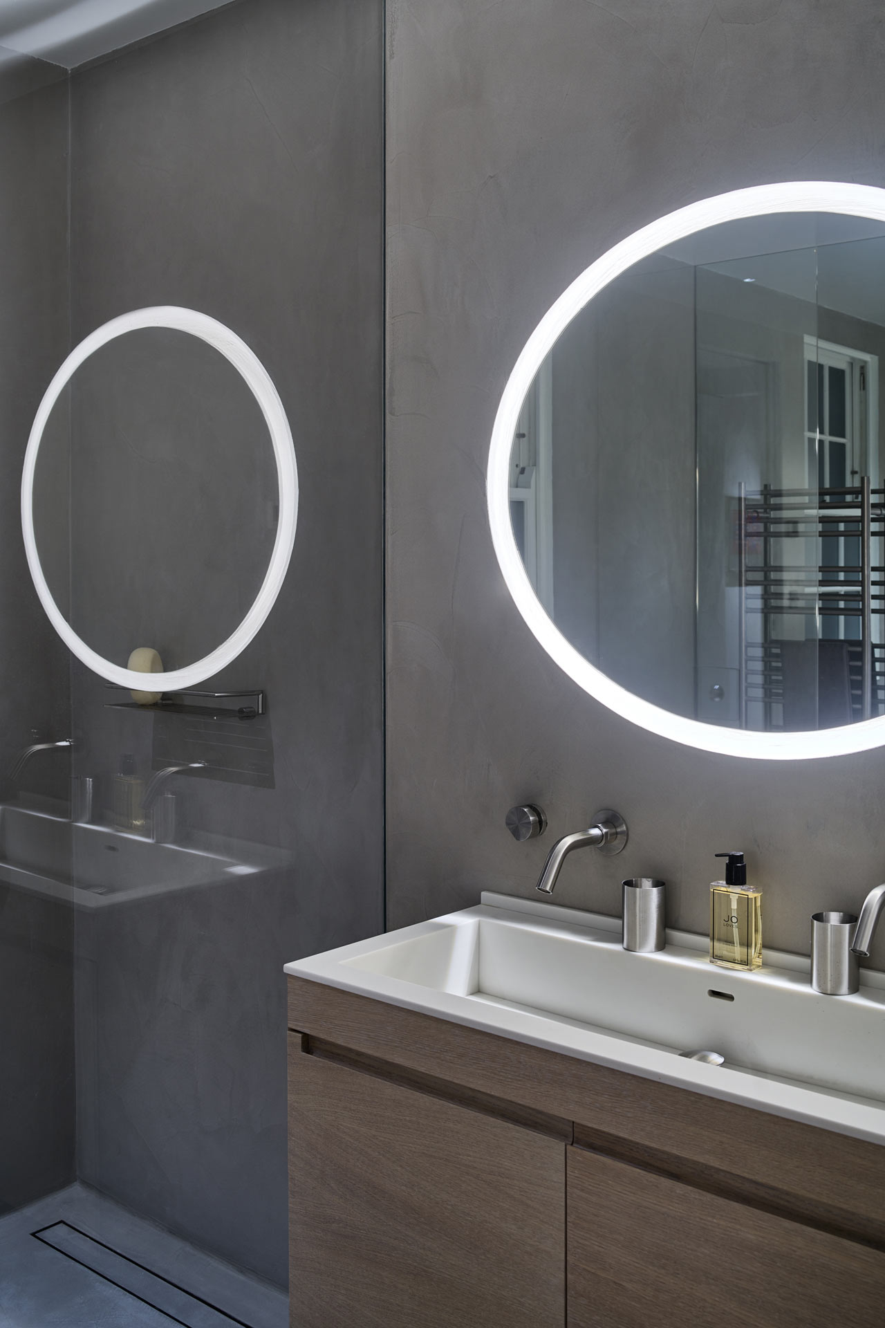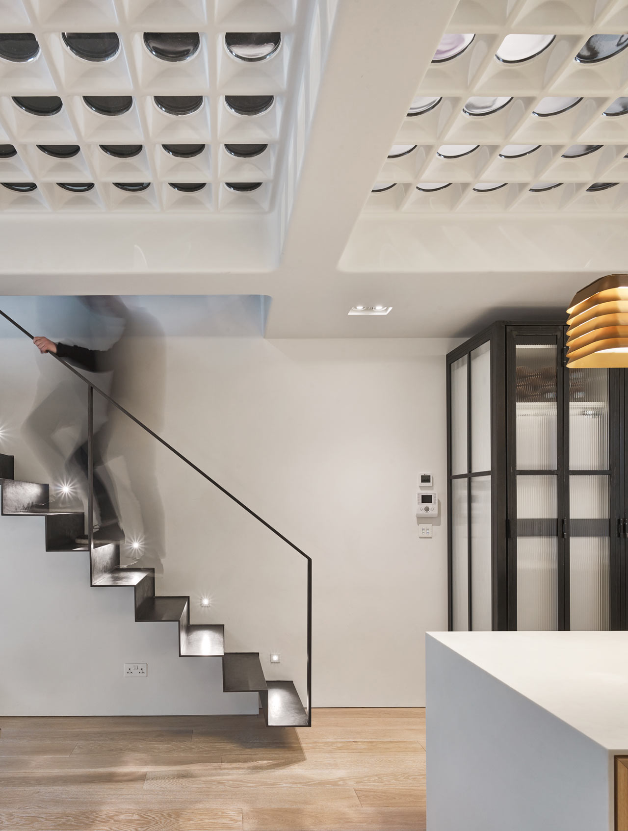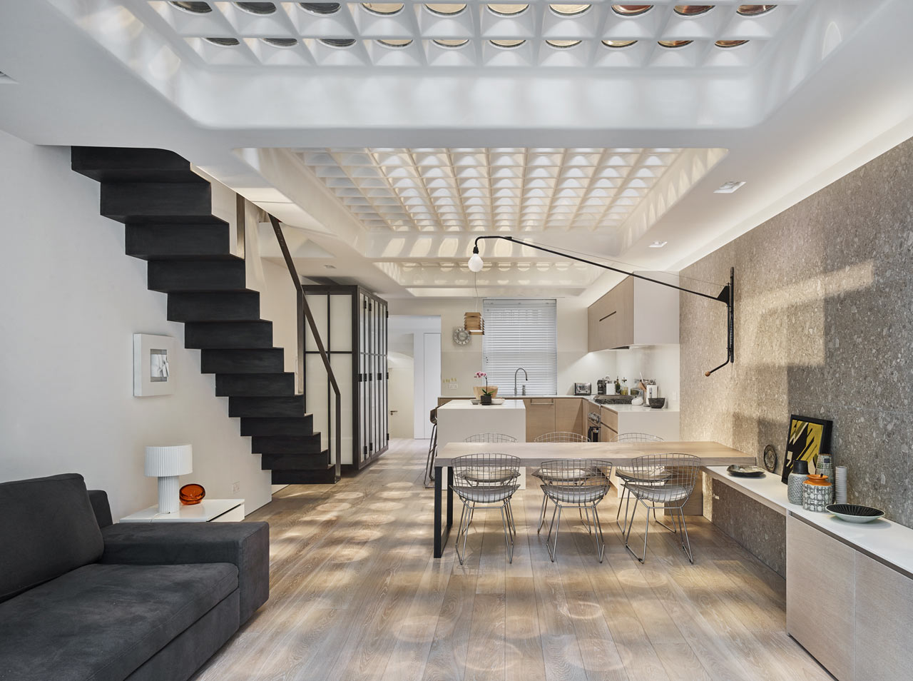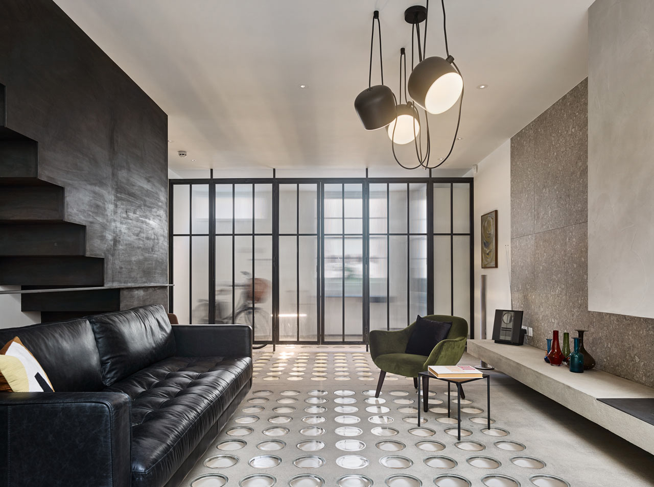 The Perf House by Andy Martin Architects makes use of a restrained palette of industrial materials – which included raw concrete and blackened steel – and combines this with refined glass, timber and carefully detailed plasterwork to deliver a relaxing but crisp interior that is perfect for kicking back and unwinding away from the hustle and bustle of central London. To overcome the issue of a dark and unwelcoming basement level, which is commonplace in Georgian buildings, AMA included a ground floor which consists entirely of footpath paving lights which have been repurposed to deliver natural light and activity to join up the first two floors of the structure.