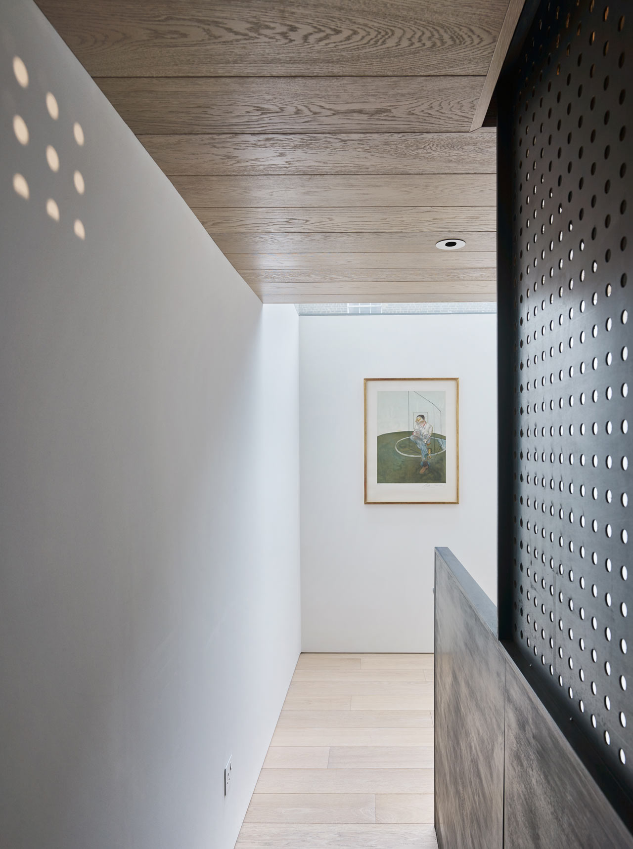Beginning at basement level The Perf House boasts a striking, handmade steel staircase which connects to the ground floor and then winds its way up to the first floor, and it’s here that the solid steel plates transform into a perforated metal spine cutting right through the building all the way up to the highest floor. The stairs have been designed as one, continuous timber sculpture, which has been made completely by hand and has a spectacular attention to detail.