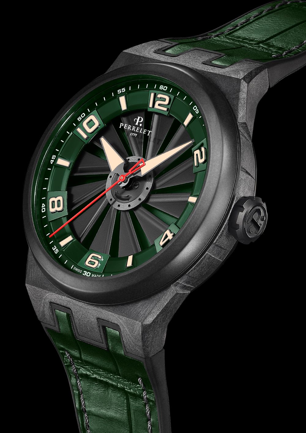 Priced at €4,750, the Perrelet Turbine Carbon Forest Green Watch is an impressive performer both from a visual and performance perspective and would rapidly become the stand-out piece in any serious collector’s lineup of watches. This great-looking accessory from Perrelet boasts the Turbine technology, that was patented by Perrelet in 2009 and is now a trademark that sets the brand apart on the worldwide watchmaking scene.