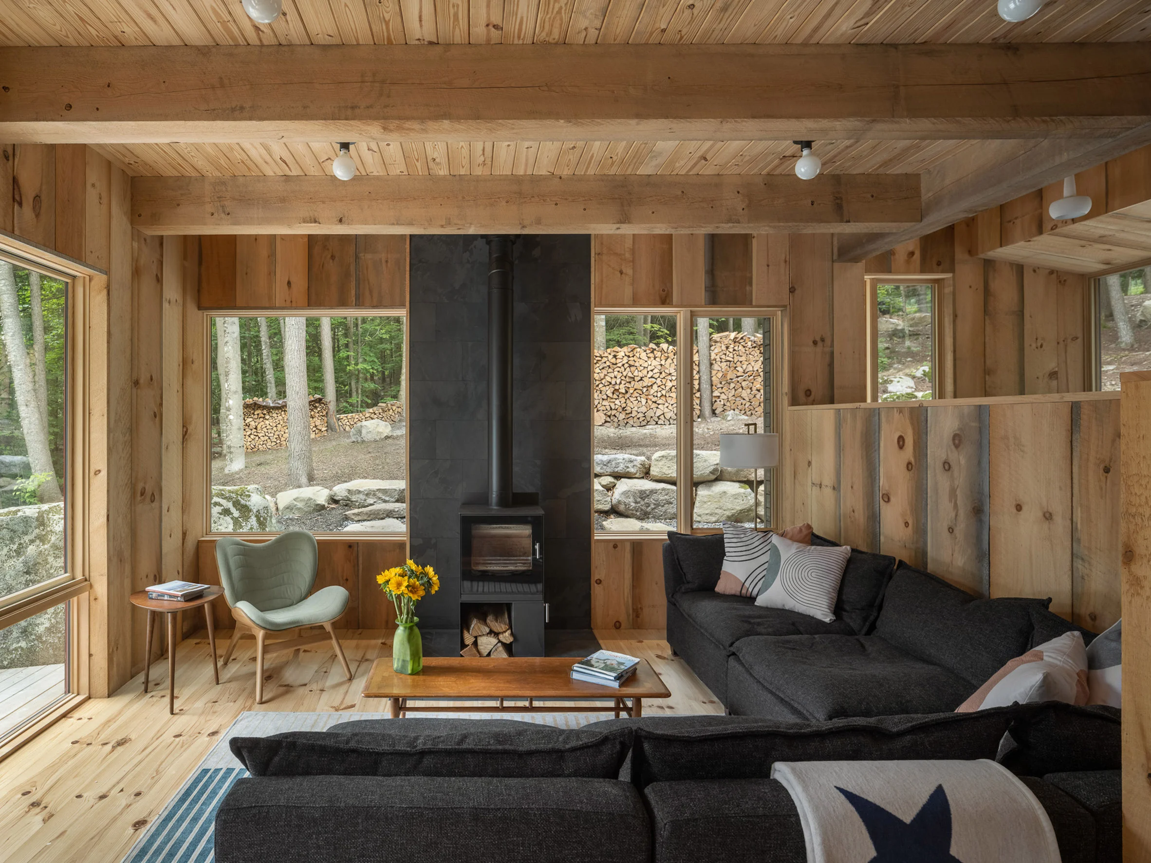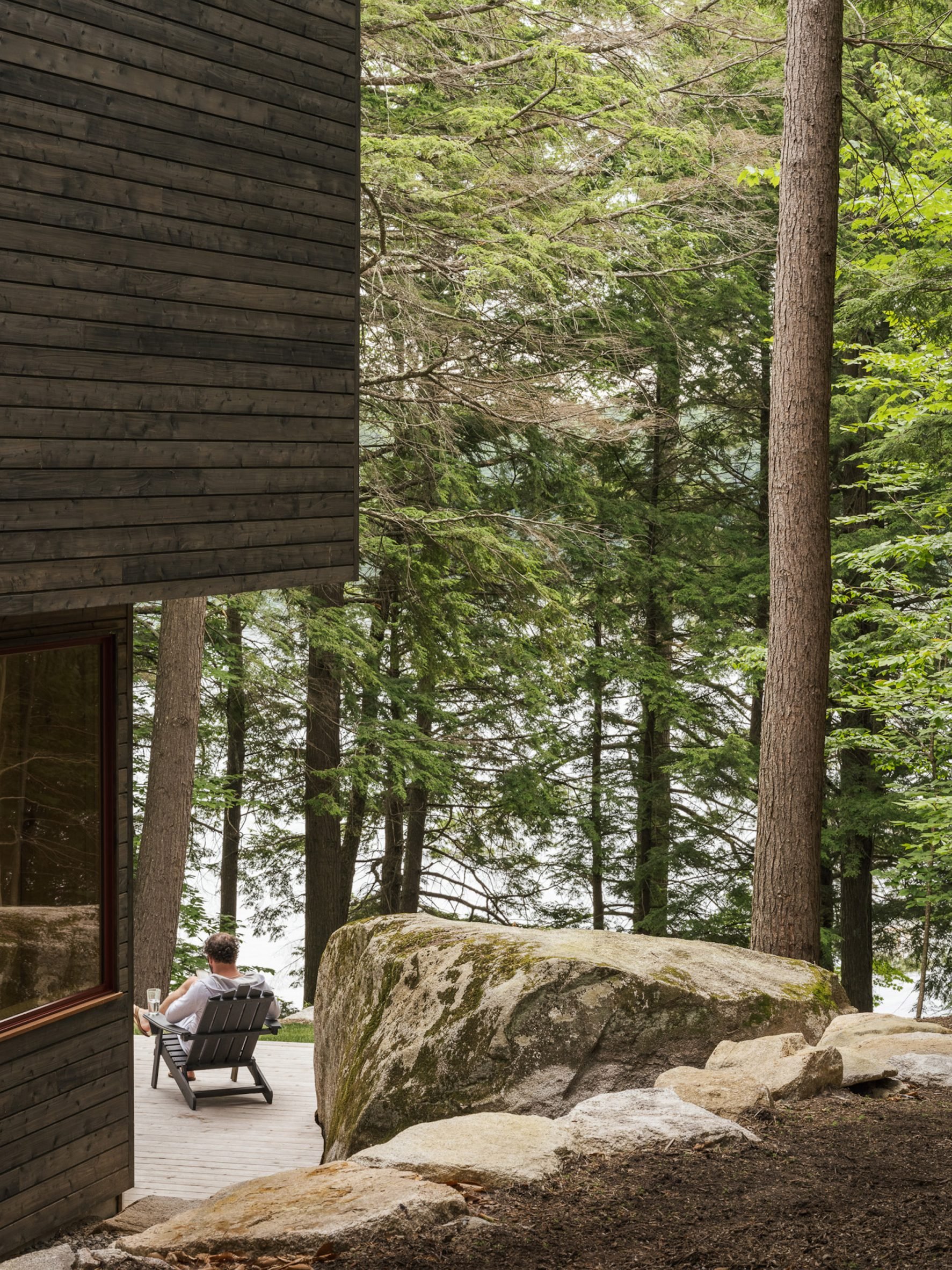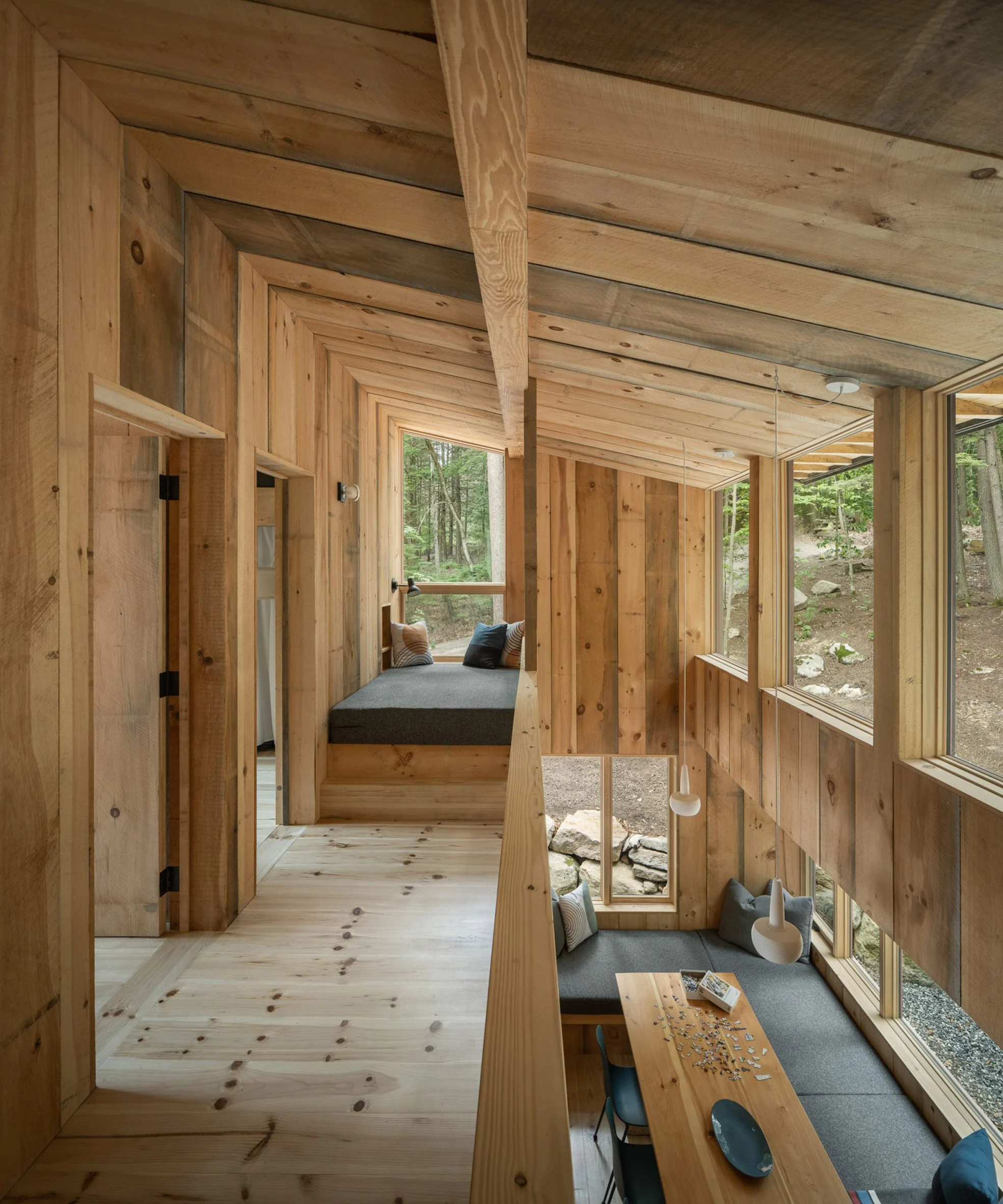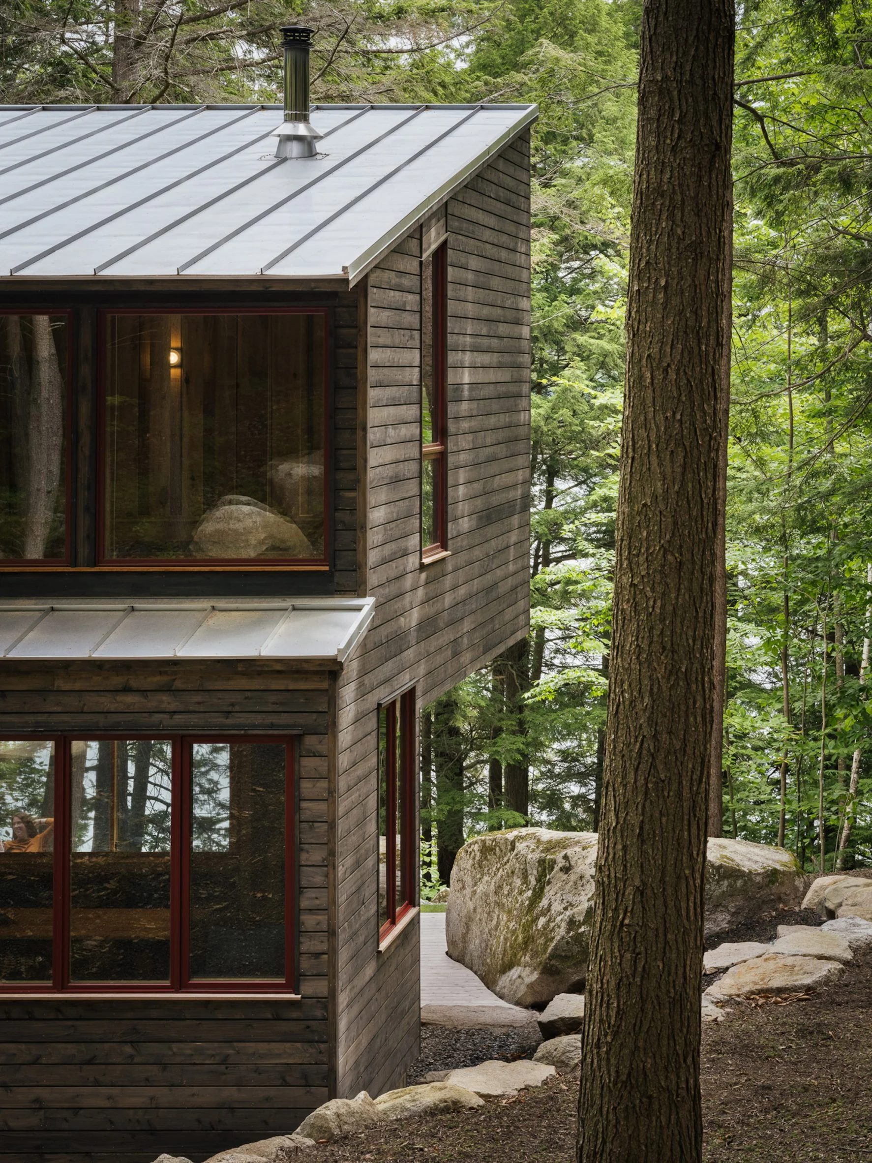 The sharp angles of Pieri Pines House in Maine stand out when seen up close, but when taken in from the adjacent dock, it blends into the treeline effortlessly courtesy of the wooden siding and the trees’ reflection in the glazing. The home slopes down alongside the site, which does an excellent job of joining the living spaces together with the environment at multiple points. The roof slopes away from the lake, leaving plenty of room on the lake-facing facade for the vast windows.