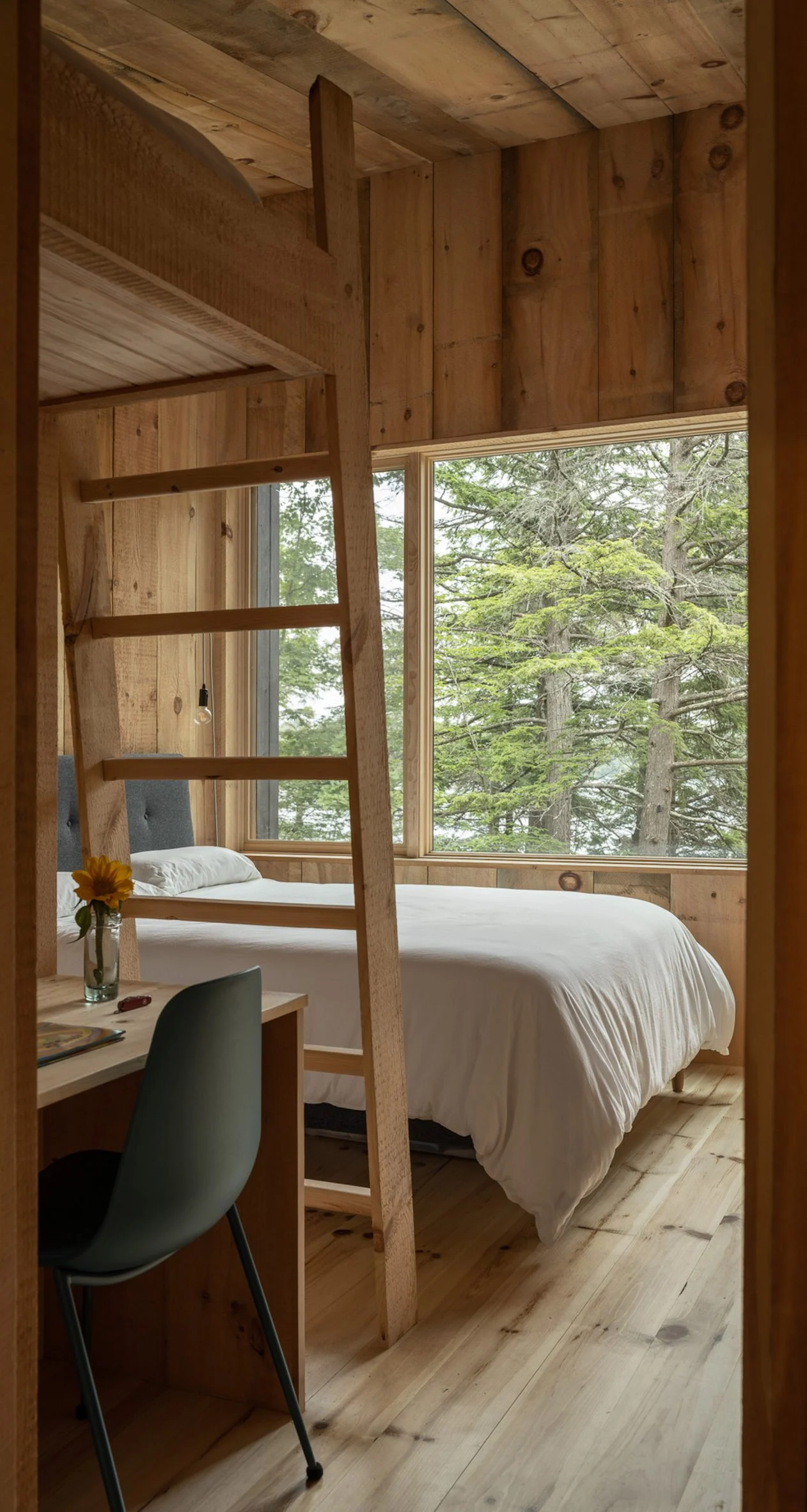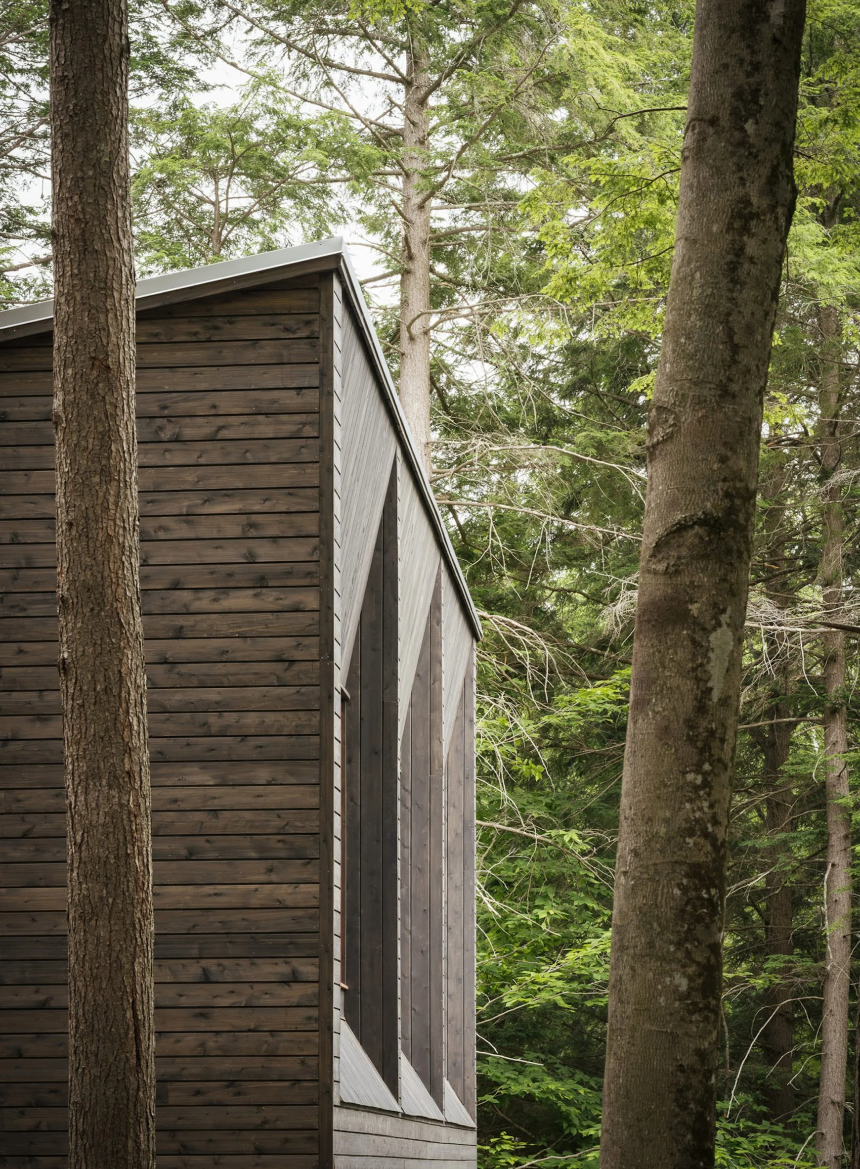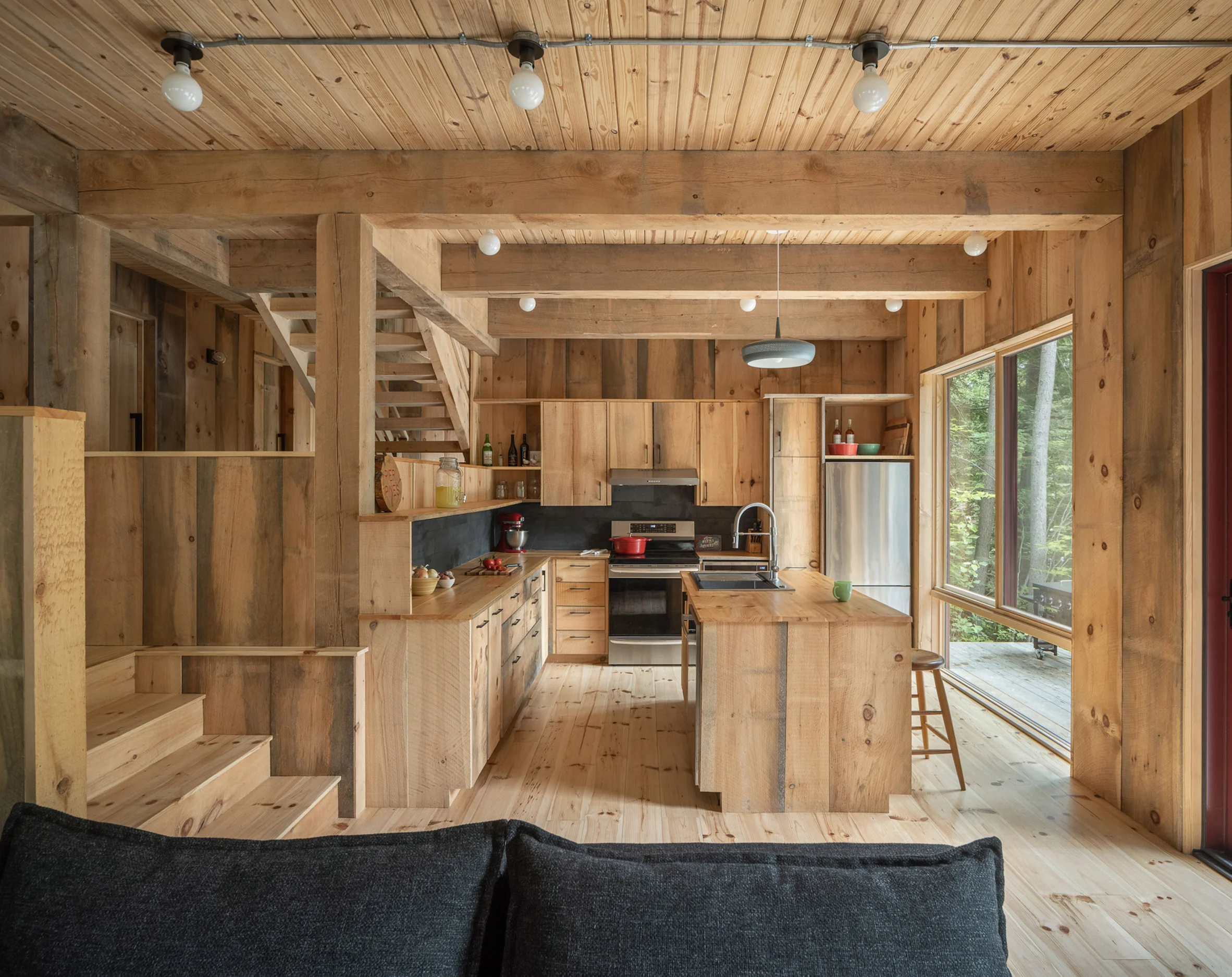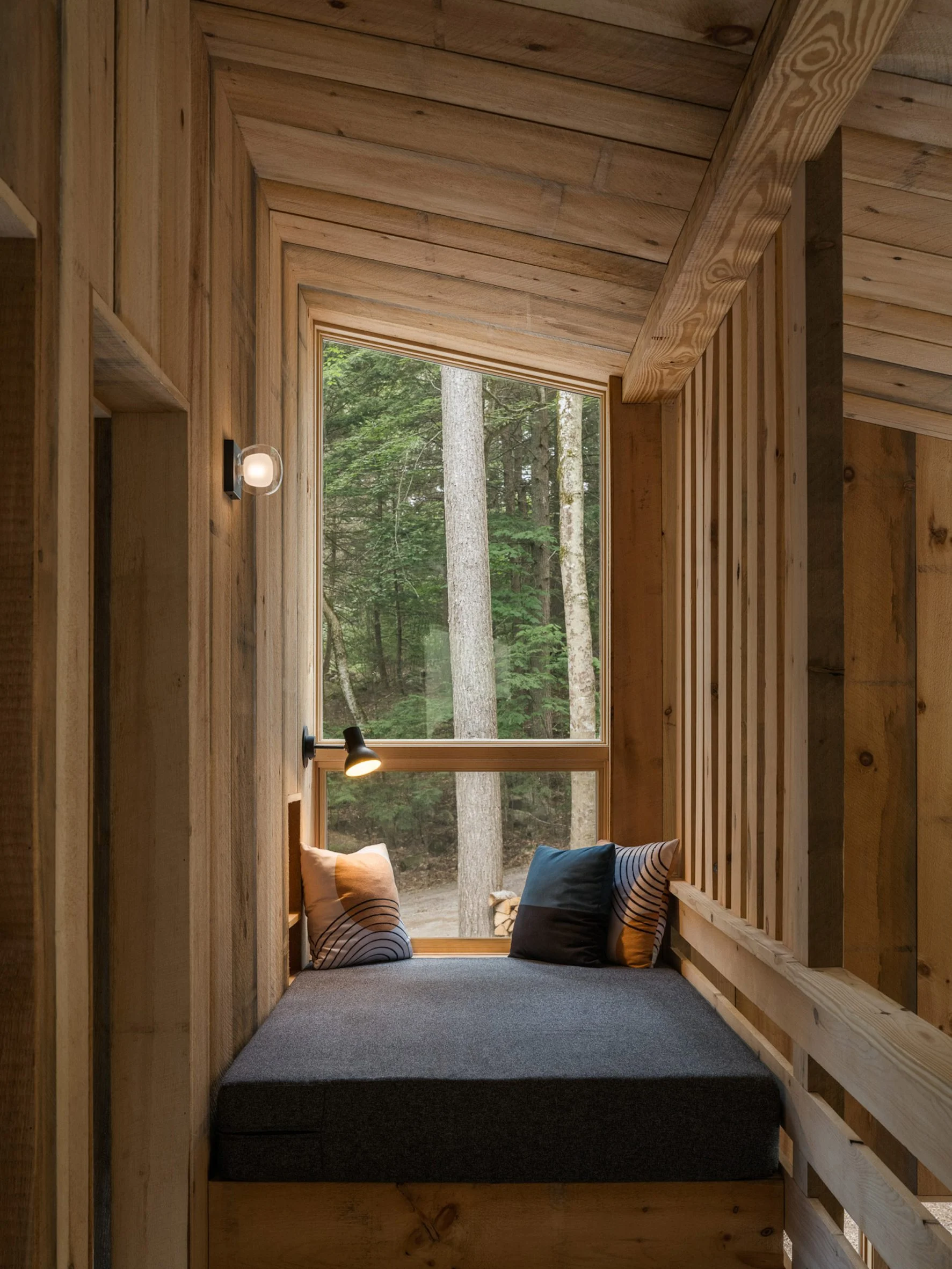The sharp angles of Pieri Pines House in Maine stand out when seen up close, but when taken in from the adjacent dock, it blends into the treeline effortlessly courtesy of the wooden siding and the trees’ reflection in the glazing. The home slopes down alongside the site, which does an excellent job of joining the living spaces together with the environment at multiple points. The roof slopes away from the lake, leaving plenty of room on the lake-facing facade for the vast windows.