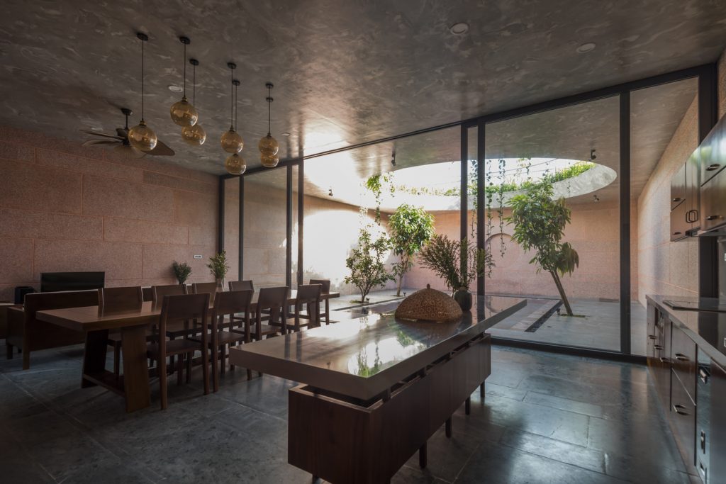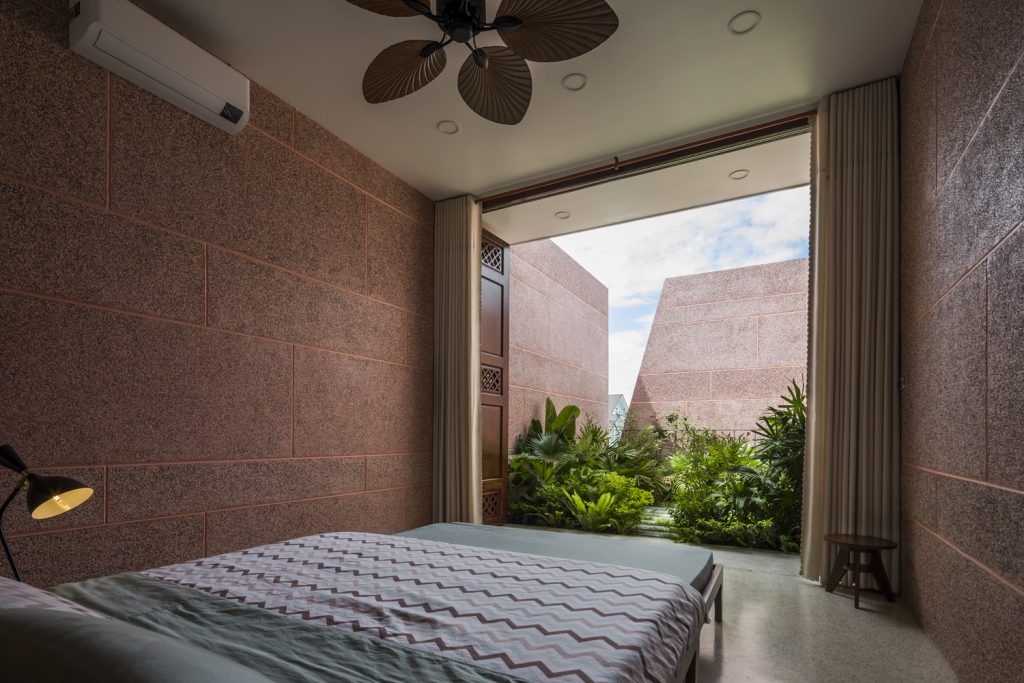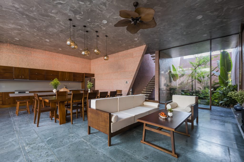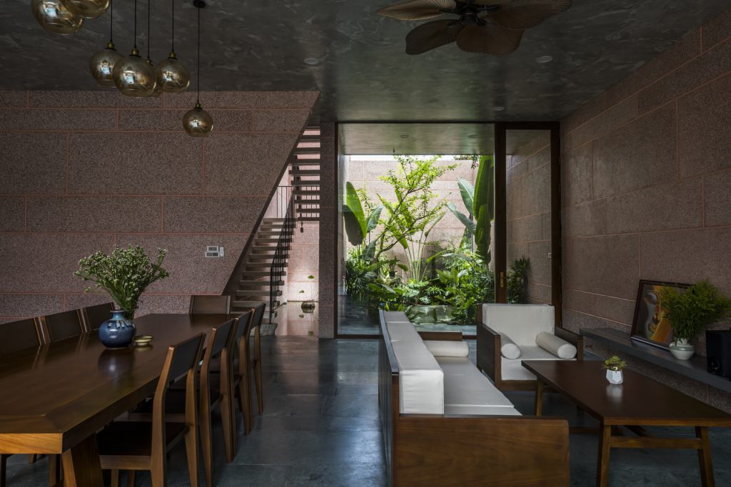 The living space of Pink House is separated into different layers with a homogeneous wash stone (granite) material both on the inside and outside, which does a superb job of blurring the boundaries between the two, only the subject and the atmosphere surrounding the subject form a solid. The architects have carefully calculated the spaces of the home based on the purpose of use and each activity that takes place within. Architecture has a special material relationship with human life, as a cover and foundation for the life that unfolds around it and few pieces of architecture exemplify this better than Pink House in Vietnam.