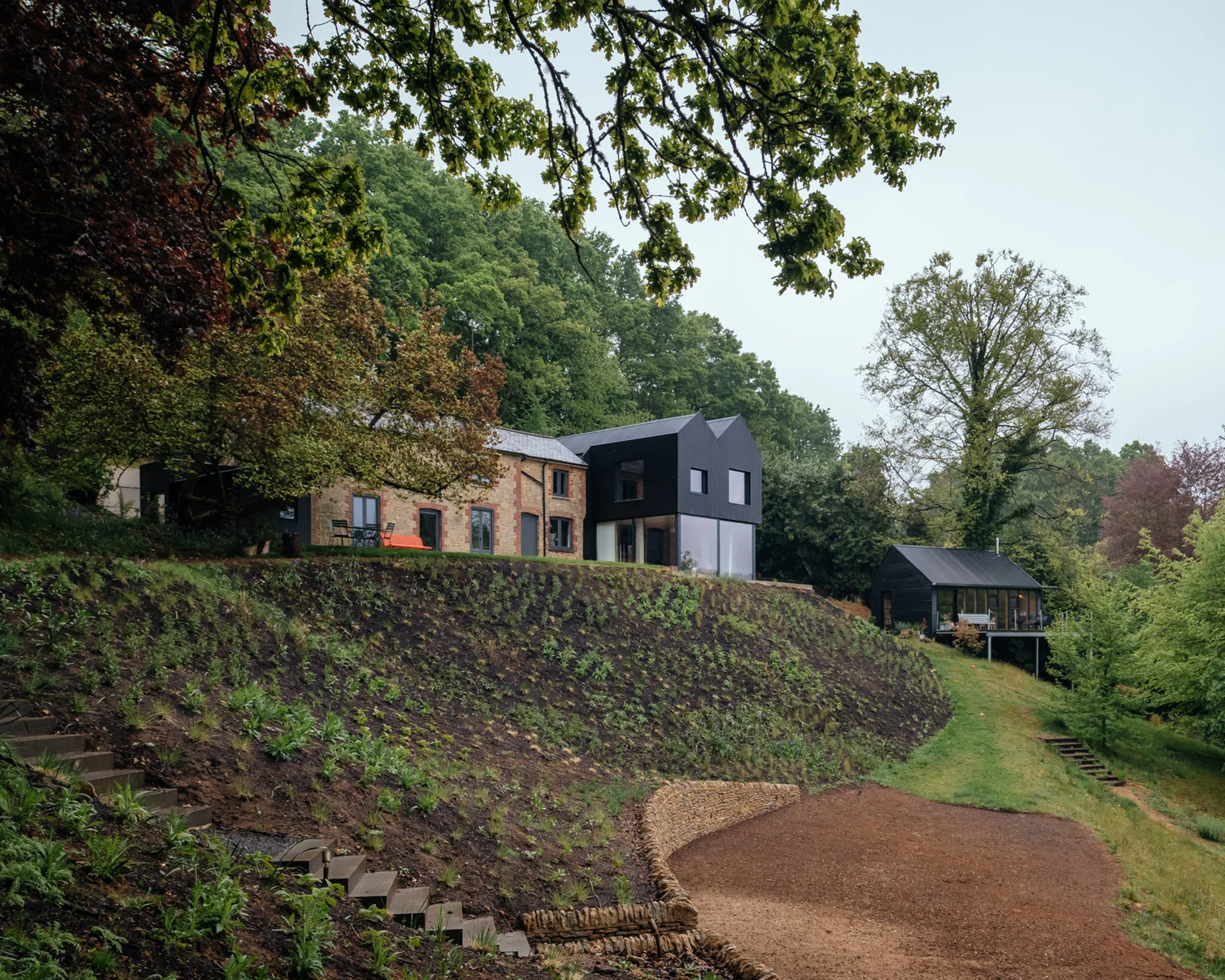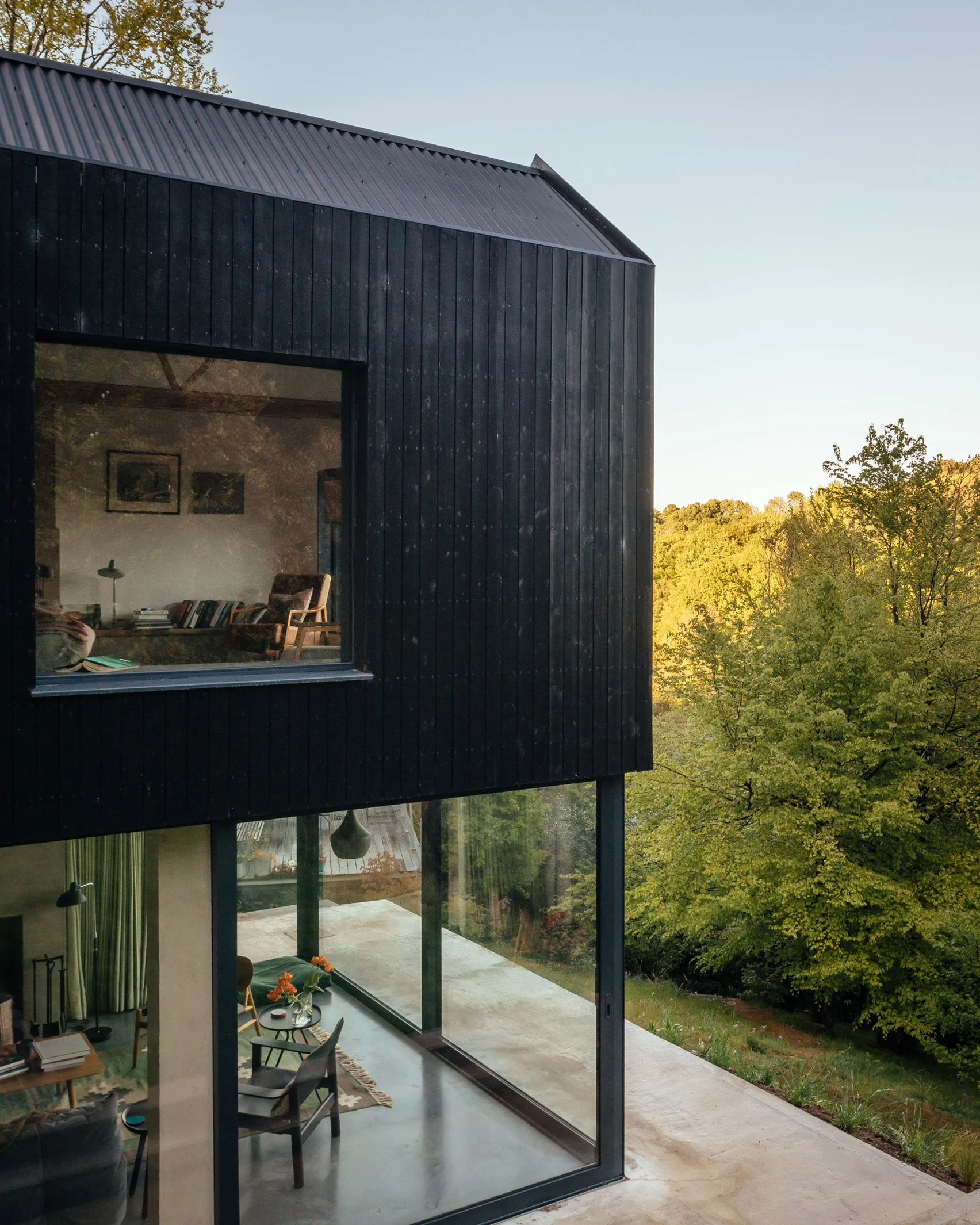 In a departure from the existing building, the addition to Playwright’s House extends forward and features cantilevered living spaces on the first floor. This provides the clients with a different perspective of the surrounding countryside and also defines a patio space for them to relax and unwind when the weather facilitates it.