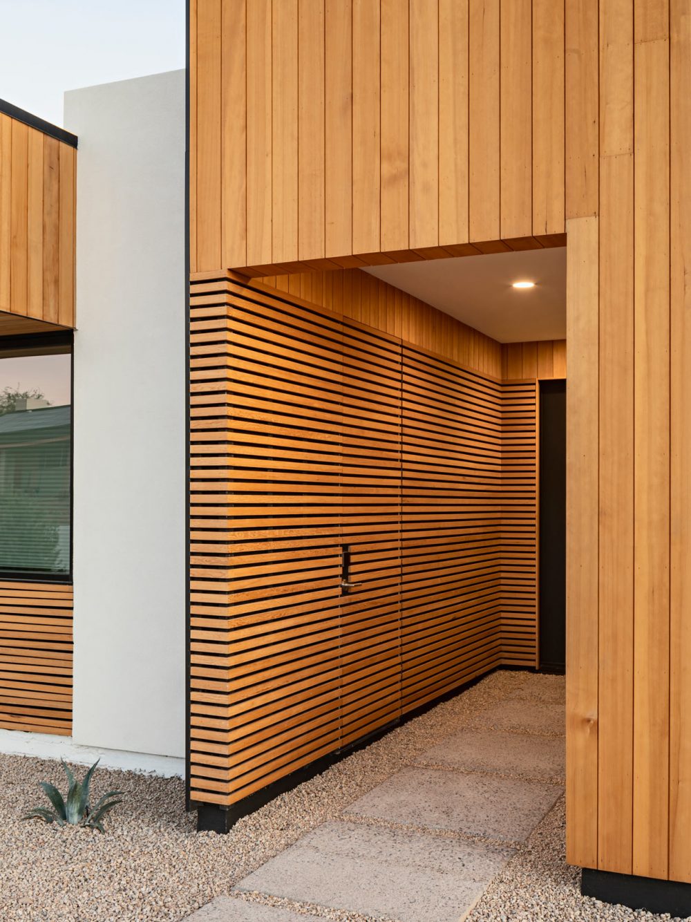 The property’s name, Pleats House, comes from the corrugated metal that covers the exterior of the gabled structure, which also resembles the pleated exterior of the Saguaro Cactus itself. The wooden panels that have been used in the design create a striking, patterned rain screen that reflects the forked ribs of the cactus plant from which the design of this wonderfully contemporary home has been inspired.