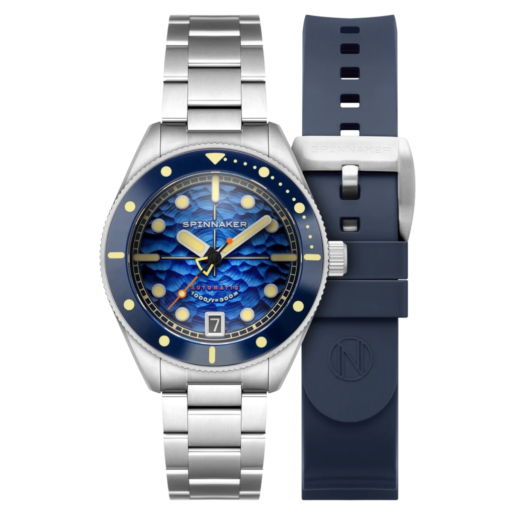 The Challenger Automatic comes ready for action with a sturdy 20mm stainless steel bracelet, complete with a fold-over buckle, safety lock, and push button for secure wear. Adding to its versatility, an extra blue rubber strap is also included, perfect for swapping out for diving or a more casual look. Spinnaker stands behind the Challenger with a 2 Years International Warranty.