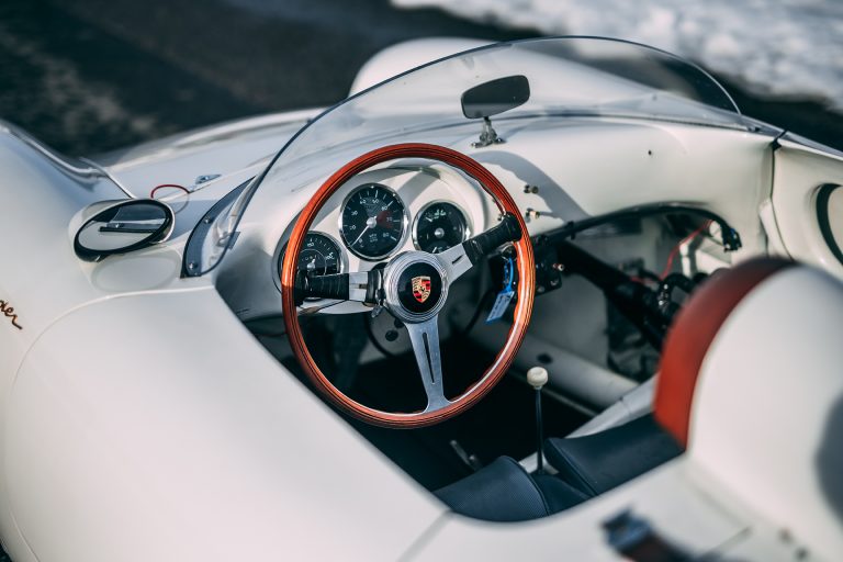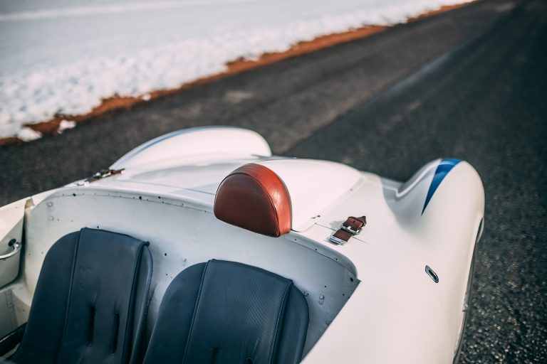 This particular Porsche 550 Spyder from Schaltkulisse has the Chassis # 550-0089 and it is the penultimate of a total of 32 pieces that left the factory in 1956. It was specially built for “John von Neumann”, the owner of “Competition Motors” in California which was a Porsche dealership with its own racing team. Equipped with numerous modifications ex works, # 550-0089 was a special feature and these included the large oval grill at the rear, two air scoops on the bonnet and the two rear fenders.