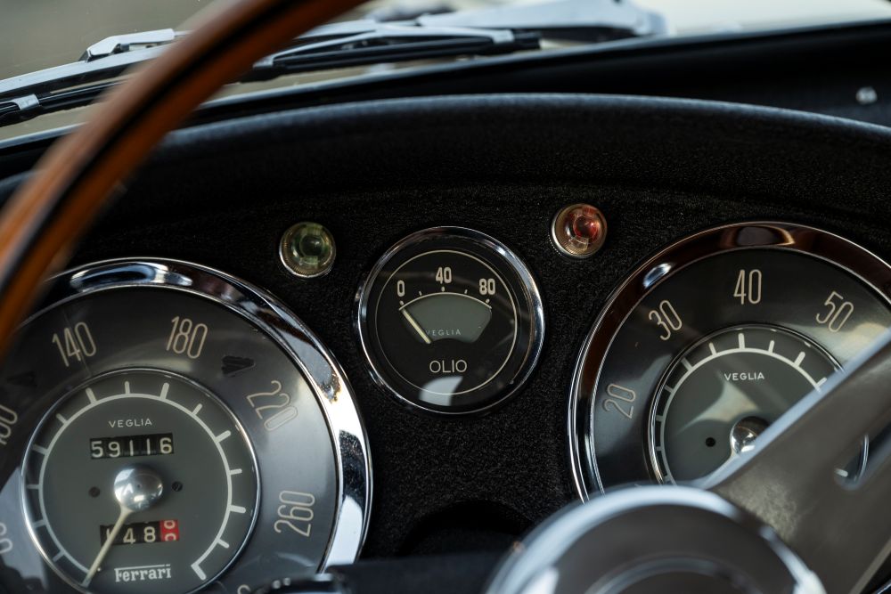 In subsequent years, 0933 GT found itself caught in a twist of fate when it was seized by French tax authorities, inadvertently preserving its originality. Legendary Ferrari collector Pierre Bardinon quickly secured it afterwards for his famed Mas du Clos collection, and it would later pass through the hands of other high-profile enthusiasts. A dedicated mechanical restoration brought this gem back to its original Oro Chiaro finish and, notably, its preserved Bordeaux leather upholstery remains available for reinstallation. The engine block is believed to be a period factory replacement—fitted in Caracas—while crucial original components like the timing case, gearbox, and rear axle remain intact, making it a remarkable survivor in an arena where many racers were lost or heavily altered.