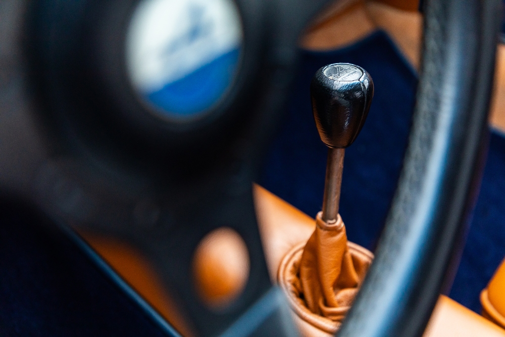 But it is the interior where this example truly sets itself apart. The cabin has been professionally retrimmed in tan leather featuring a diamond-quilted pattern that adds a touch of gentleman-driver luxury to the otherwise purposeful cockpit.
