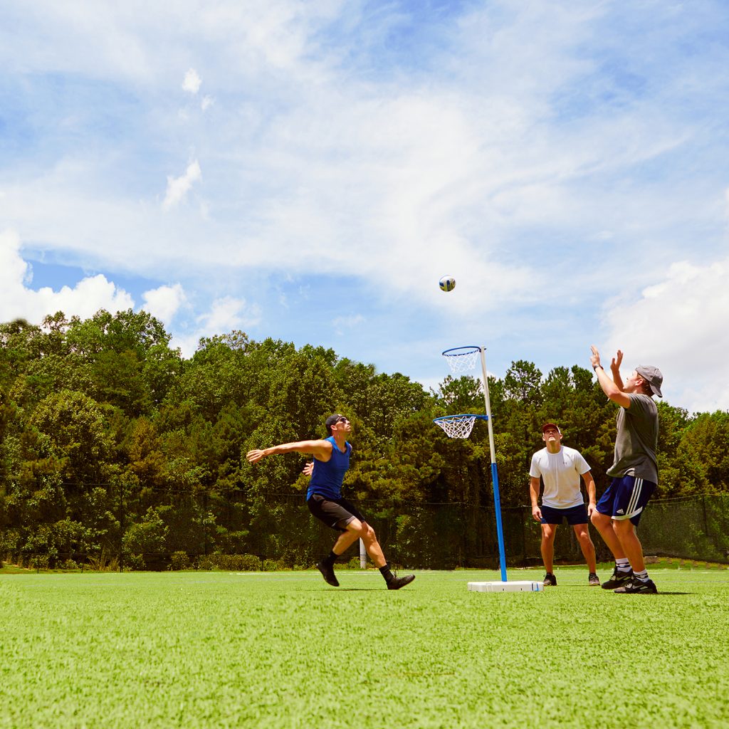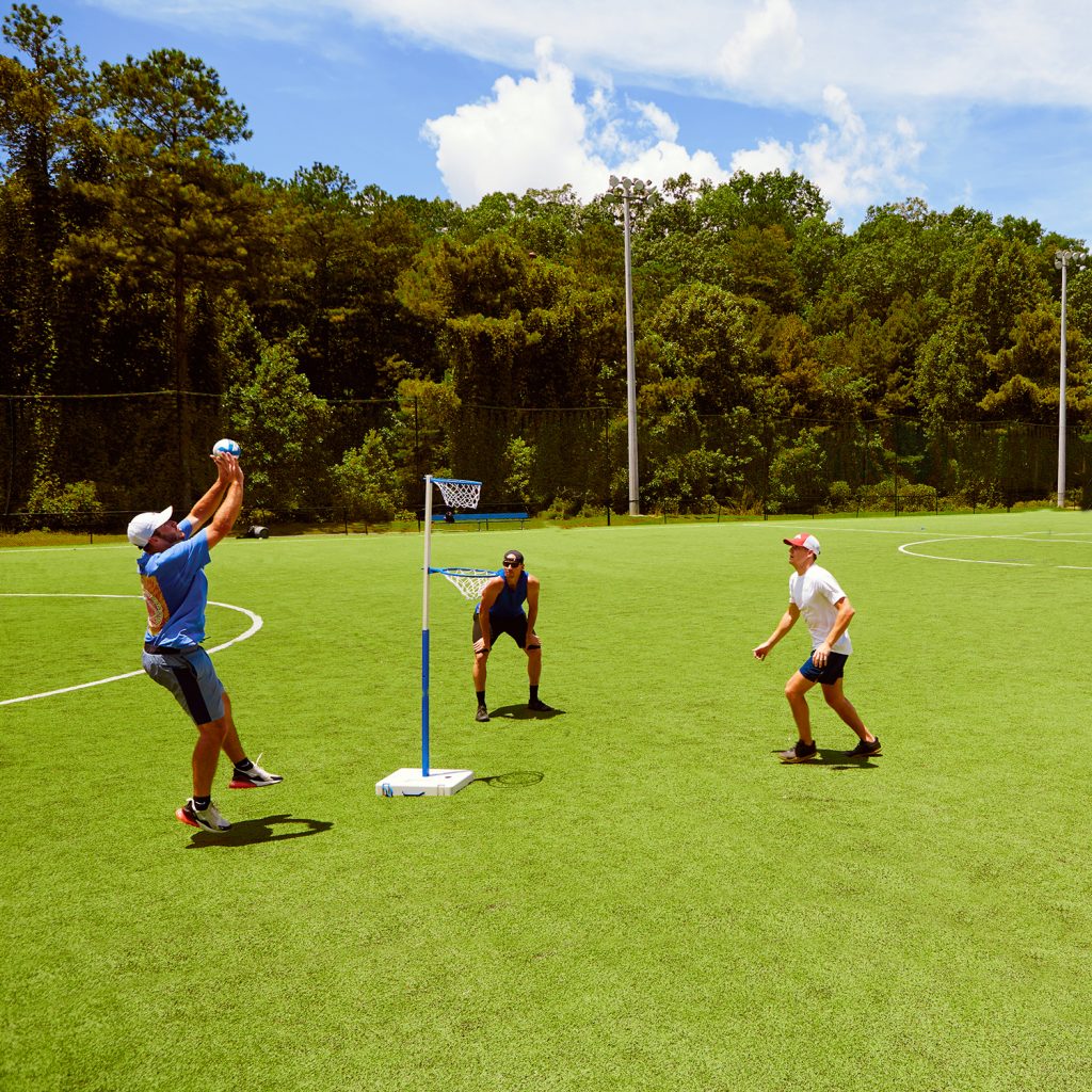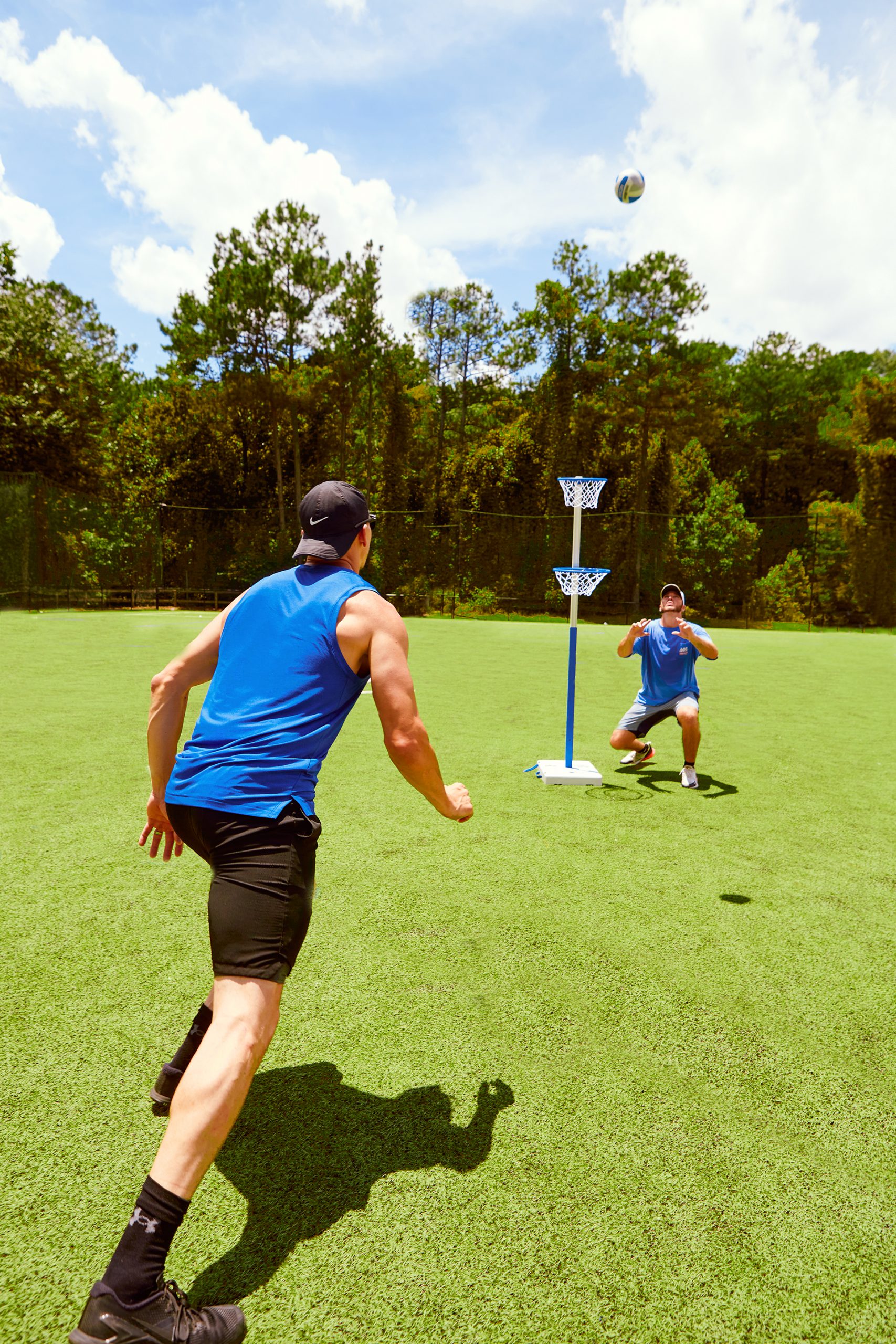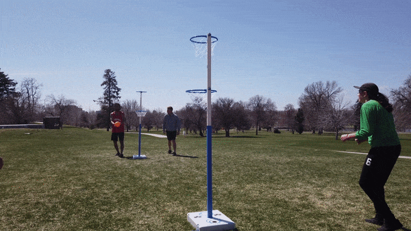 RallyHoops is a fast-paced, four-player (2 vs 2) game that is rapid to set up, straightforward to grasp, yet difficult to master. This full-court game is played with two different-sized hoops on each side of the court and there are different scoring options, depending on who scores in which hoop, but a team has no more than 3 hits per team rally. Games are played to 21 points, but that doesn’t mean the game is over. Each player on the trailing team has 1 redemption shot to rally back and continue the game. When you start playing, it will all quickly make sense and the fun times will ensue.
