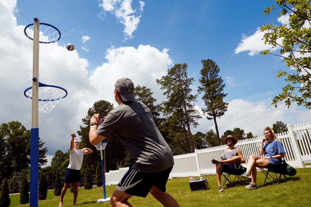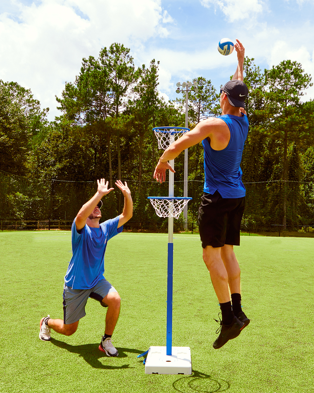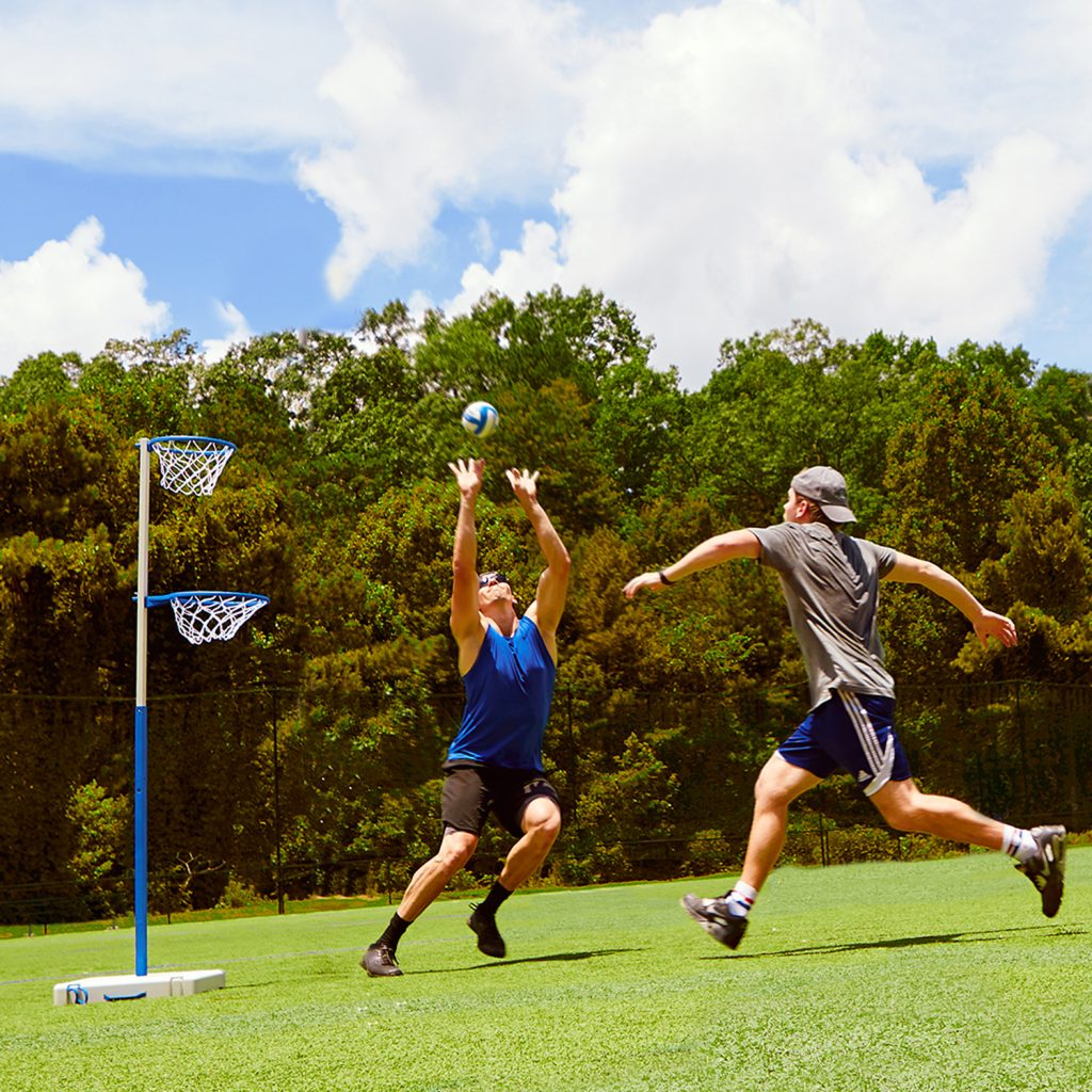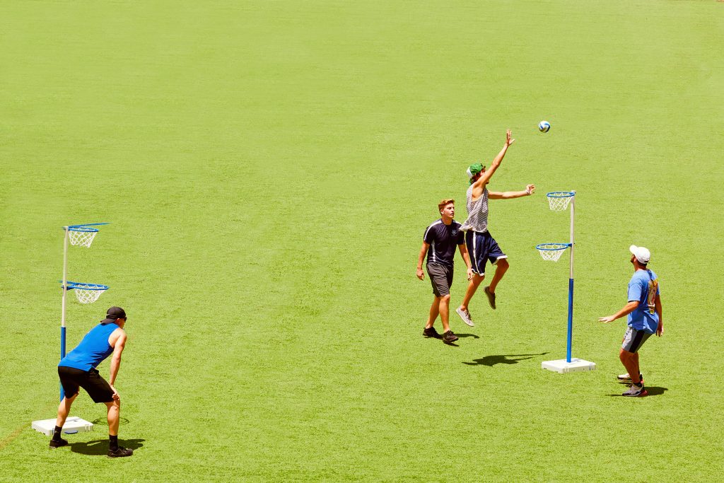 RallyHoops is a fast-paced, four-player (2 vs 2) game that is rapid to set up, straightforward to grasp, yet difficult to master. This full-court game is played with two different-sized hoops on each side of the court and there are different scoring options, depending on who scores in which hoop, but a team has no more than 3 hits per team rally. Games are played to 21 points, but that doesn’t mean the game is over. Each player on the trailing team has 1 redemption shot to rally back and continue the game. When you start playing, it will all quickly make sense and the fun times will ensue.
