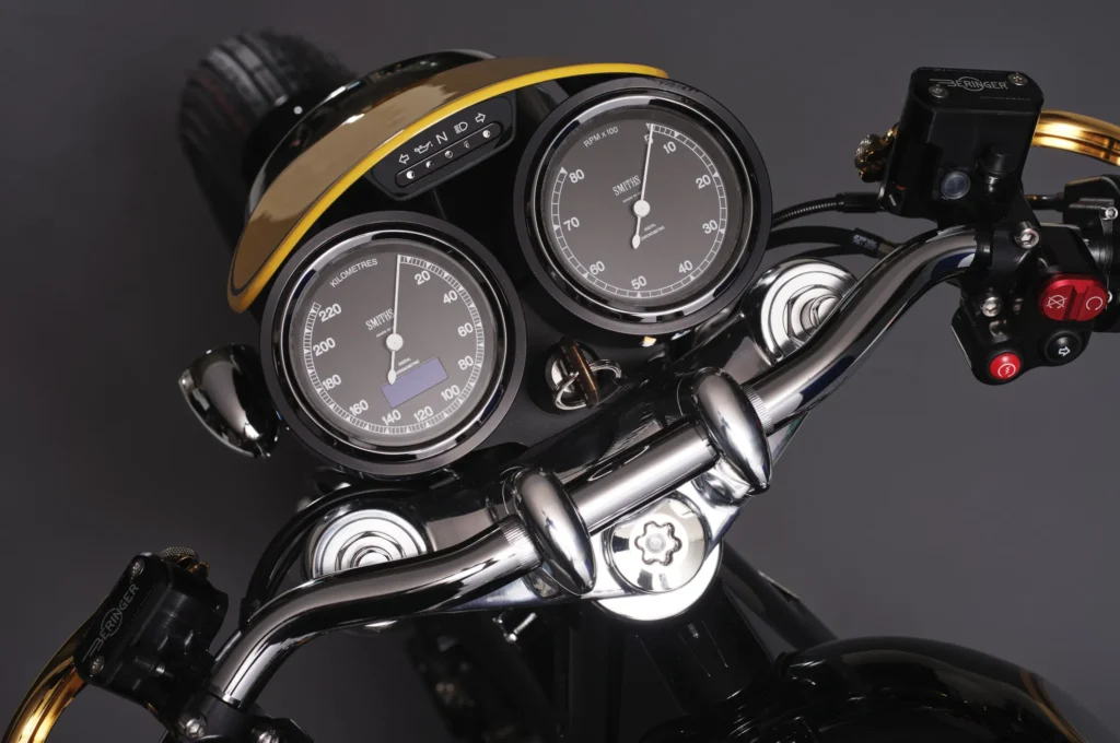 For the build of the R100 Cafe Racer, Renard carefully chooses the materials and components that they use, ensuring to use period correct parts but ones that have been newly produced such as Tarozzi foot controls, Beringer brakes and Hattech exhaust systems. Aluminium construction extends to the petrol tank and body panels of this eye-catching steed which can be either painted or polished to achieve the distinctive aviation aesthetic. The seats are crafted from genuine leather, and Renard offer custom-made helmets and riding jackets that match your bike’s colour scheme and personal measurements.