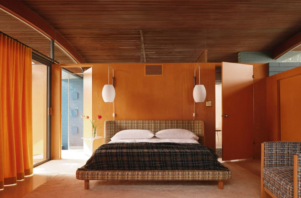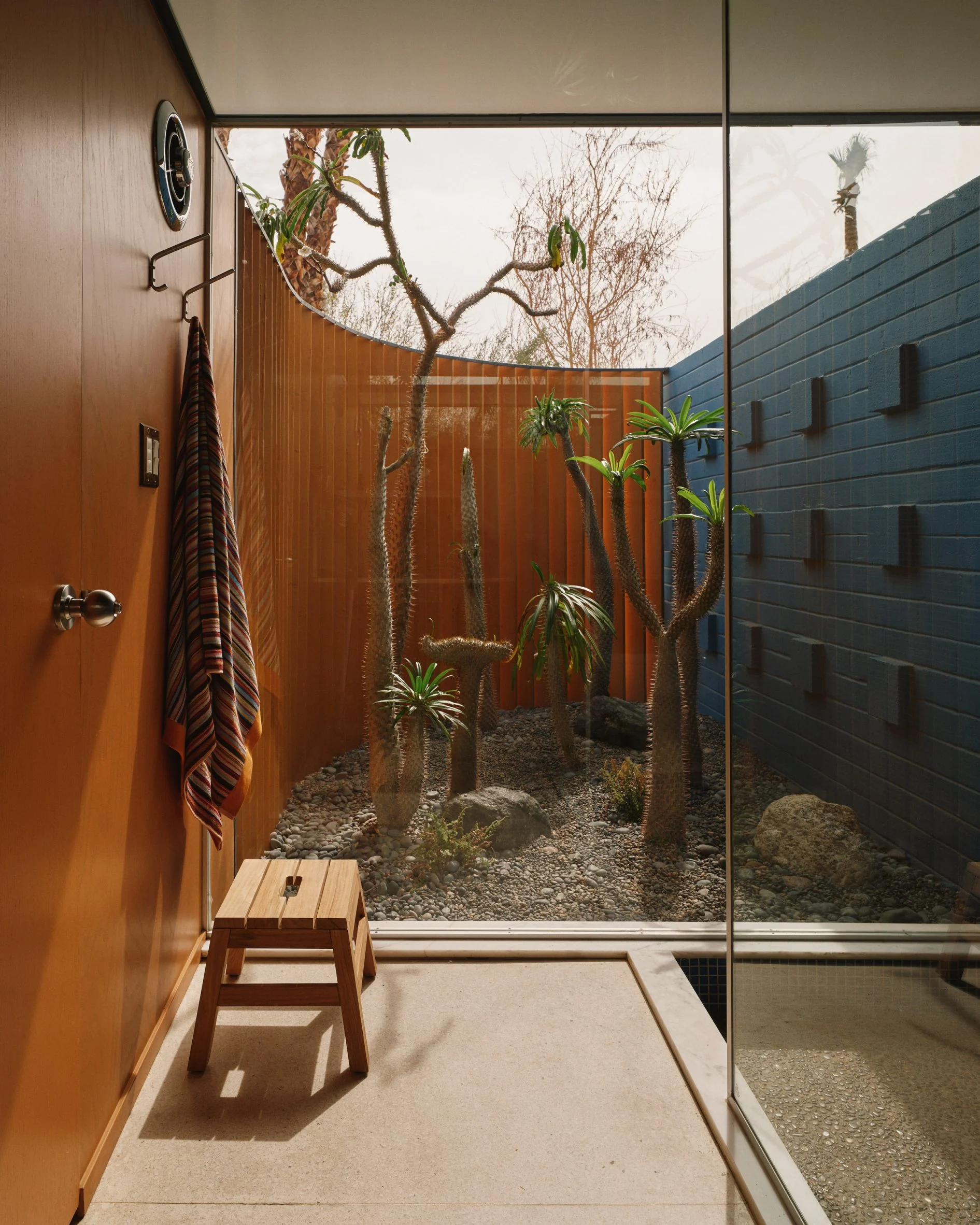 The architecture itself is a spectacle. The curving roof doesn’t just look cool; it cleverly mimics the forms of the nearby San Jacinto mountains and is beautifully expressed inside with warm wooden slats. The exterior walls, largely glazed, slide open effortlessly to connect the interior with a rocky rear garden and a sparkling swimming pool – the quintessential California modernist indoor/outdoor living experience. Painted brick walls provide privacy from the street and, along with plywood panelling, help define the interior spaces.