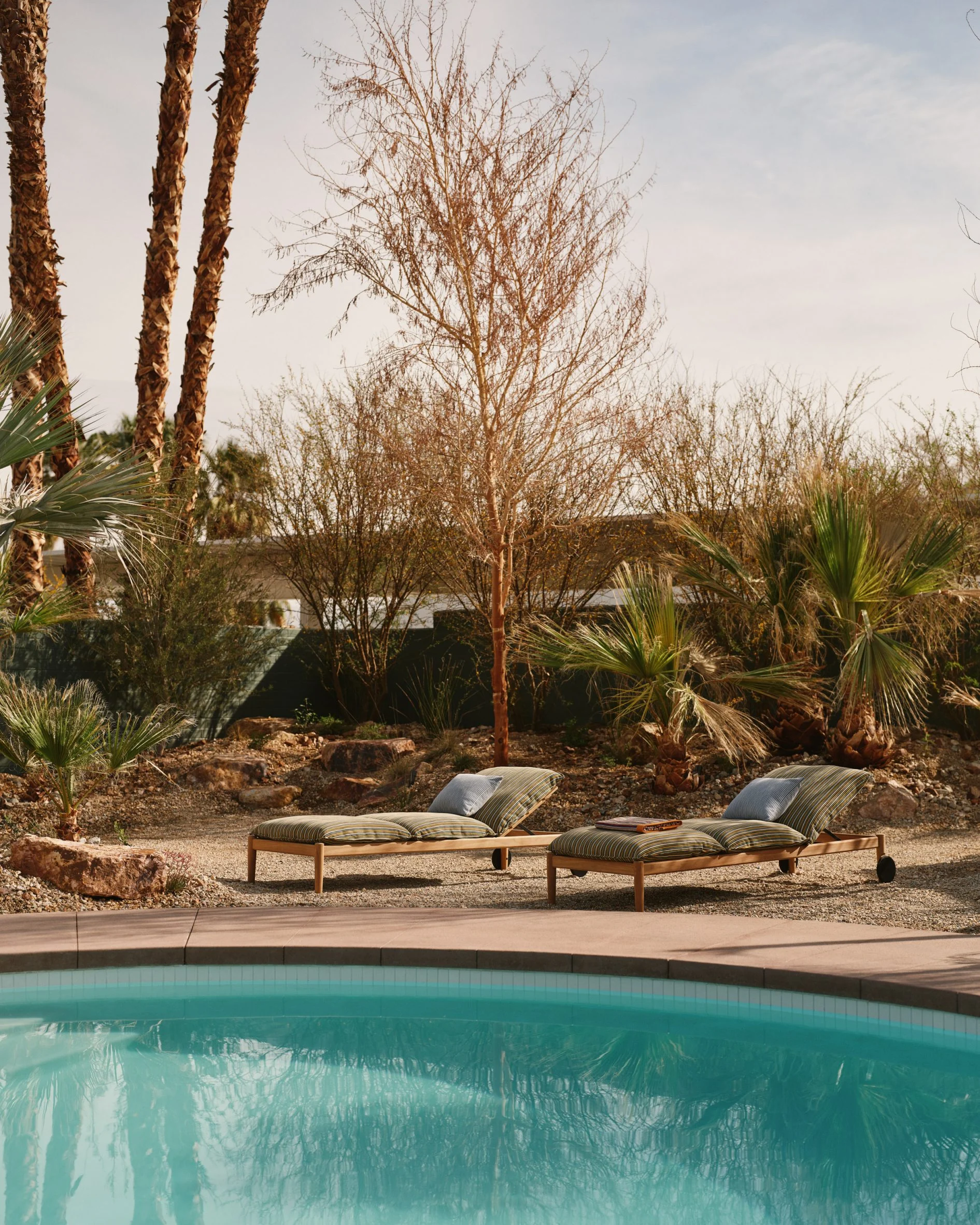Smith’s instantly identifiable aesthetic is woven throughout several rooms, applying his signature fabrics, originally created for textile brand Maharam, to special-edition furniture pieces from design heavyweights like Herman Miller (including the Eames Moulded Plastic Side Chair) and Knoll (featuring Eero Saarinen’s Womb Chair). You’ll find his signature stripes adorning cushioned loungers by the pool – perfect for soaking up the desert sun in style – as well as a sofa and armchair in the living area.