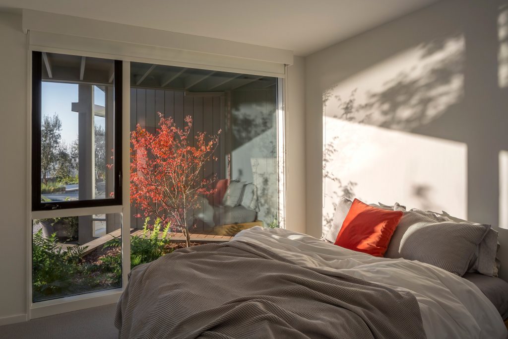 Frame Studio added even more windows to the two wings of Ridgewood House – which feature the bedrooms in one, the lounge, kitchen, dining room, and den in the other. A additional bedroom was treated to a new glass wall modelled on an existing one in the main bedroom, while the kitchen’s original small windows were merged into one larger one which helps to bathe the interiors with natural light.