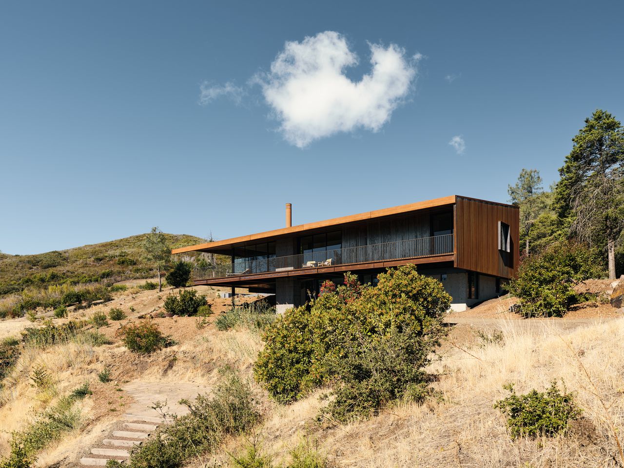 Remotely accessed via a winding former stagecoach road in the Mayacamas Mountains northeast of Healdsburg, this striking project is an absolute masterclass in extreme resilience and landscape-driven design.