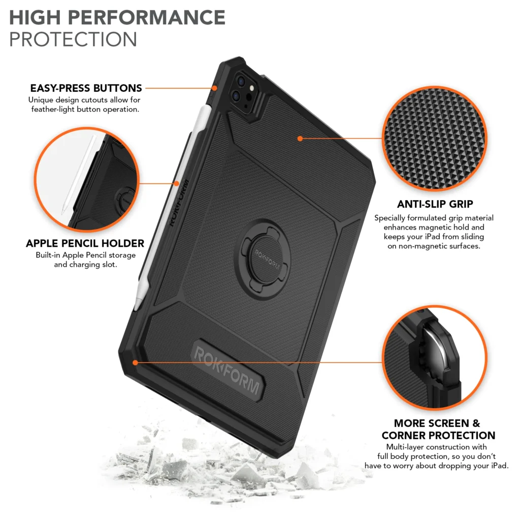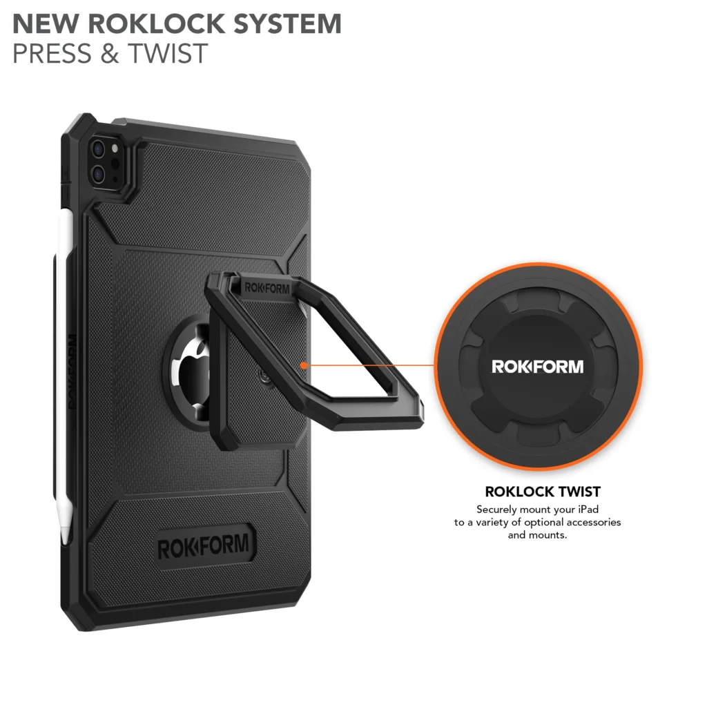 ROKFORM wanted to create this accessory to keep your iPad protected and safe day in, day out. The built-in twist lock with optional accessories can be tailored to the demands of almost any work scenario. Built-in magnetic mounting allows for safe hands-free mounting on almost any magnetic surface, allowing you to get more done because the job knows you have better things to hold onto.