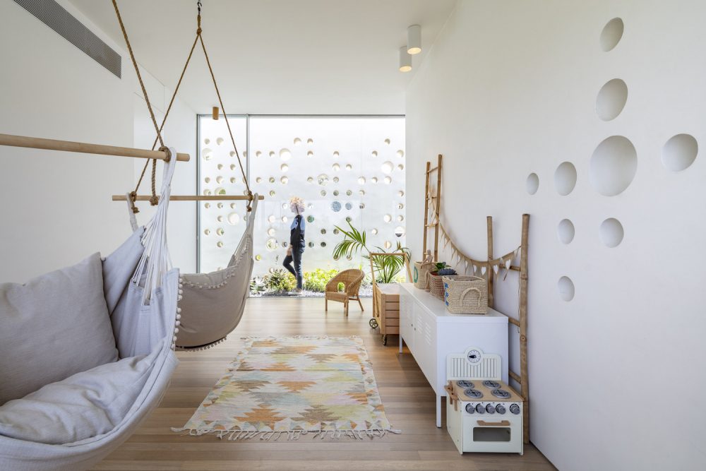 Cleverly thought out, the use of space in the Round Edge House in Israel makes this piece of architecture all the more impressive and functional for those living there. The concrete cylinders that were drilled out of the wall are scattered along the garden, used as floor paving. The perforated wall transfers natural light into the house during daytime and by night transfers artificial light outside, illuminating the street with its special glow.