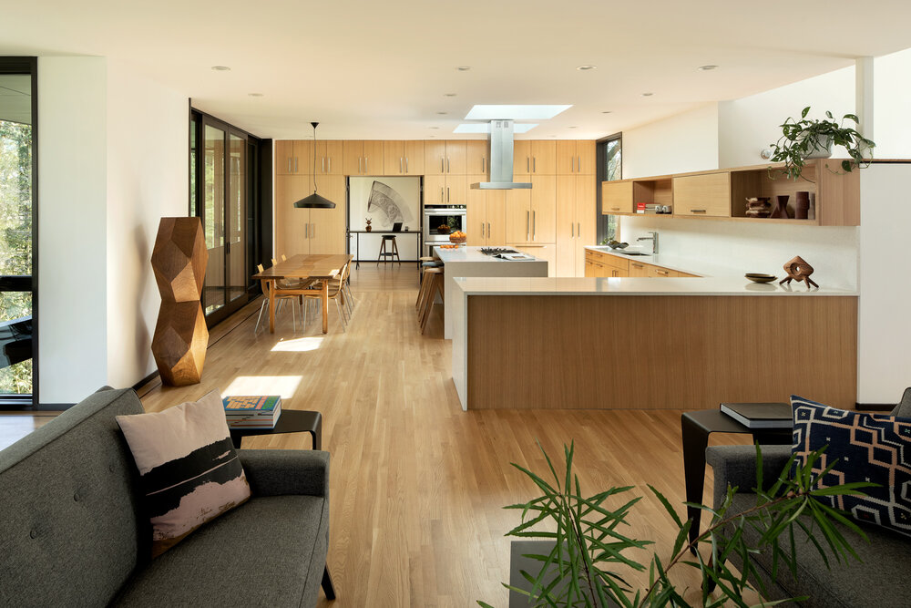 On the Royal House’s all black front, there is an attached garage unit which is fronted with glazed doors and a grouping of clerestory windows which run along the top of the one-and-half-storey foyer. On the inside, the entry hall opens up to the main living space and has eye-catching white oak floors with walnut border inlays. Vast windows and sliding glass doors in the room bathe the interiors in natural light and delivers amazing views of the natural landscape.