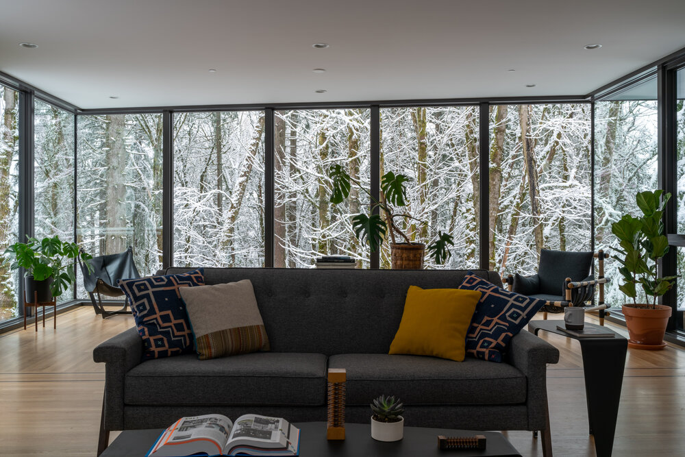 Royal House is positioned on one of nine plots which are owned by the design studio and its partners that extend into Forest Park, an urban forest with hiking trails, near downtown Portland. The overall thesis of this eye-catching piece of architecture was to live among the trees and has large expanses of glazing and 735 square feet of exterior deck which surround the house to look out onto the glorious deciduous site and its natural flora, which includes Douglas fir trees and vine maple.