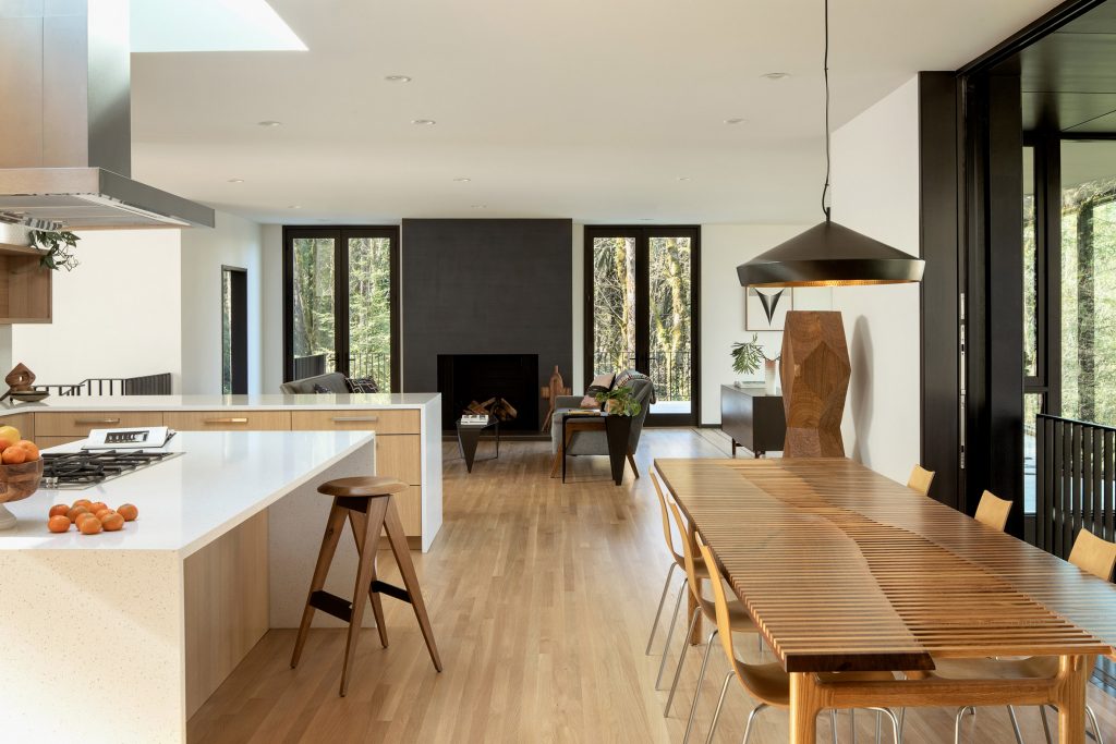 The living area of Royal House in Portland has a grey dual-fuel fireplace which has been perfectly paired with a number of wood furnishings that were custom-built by local studio The Good Mod. The wood pieces include a long dining table, kitchen stool and chairs and each of the four bedrooms is oriented towards the east where the sun rises and has an attached balcony for making the most of the wilderness setting.