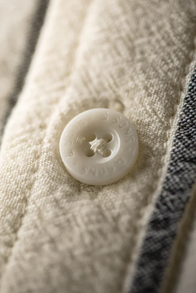 The meticulous attention to detail carries through to the finishing touches, featuring an embroidered brand logo at the gusset, a self-fabric back neck hanging loop, a clever button fastening at the centre back collar, and premium Corozo buttons that add a final touch of rugged class.