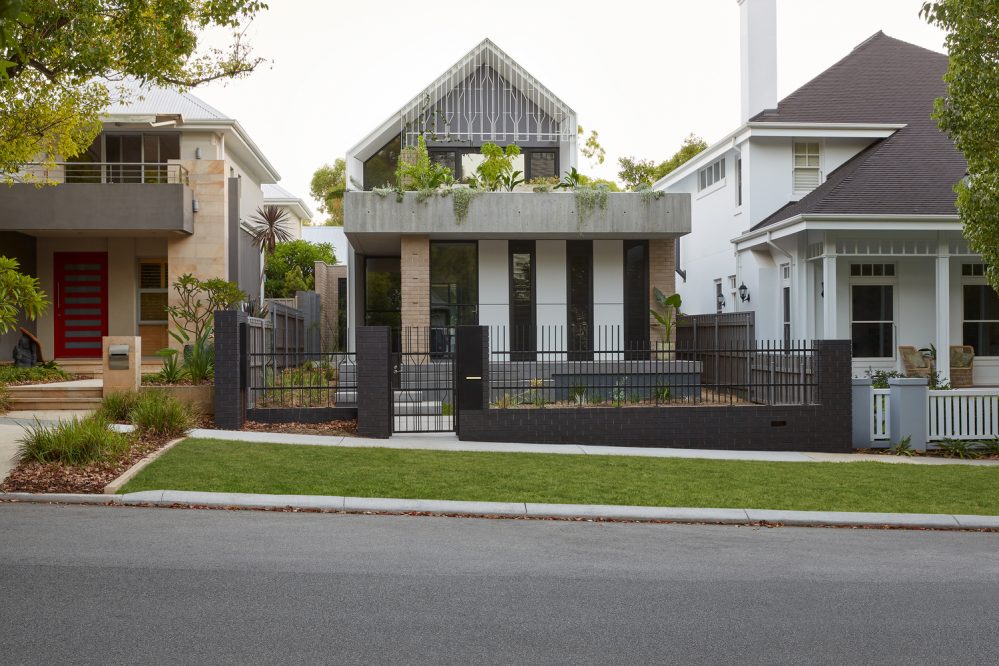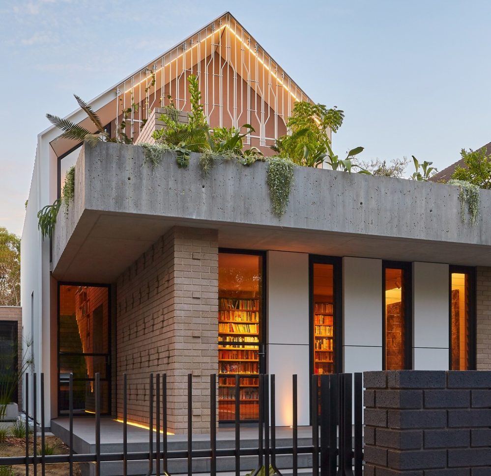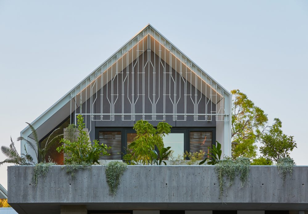 The RZB House from Carrier & Postmus Architects is nestled between a series of living ponds working as breeze activated evaporative coolers, and on its upper floors it opens out to mature tree canopies with excellent views of the park beyond.  The look of the property has been devised for a music aficionado and a talented artist with a shared love for Perth’s natural landscapes and environments. Endemic Solya and Kennedia plantings will climb the decorative trellis of the property to become its landscaped street address, with more native plantings enveloping RZB House’s brickwork base.
