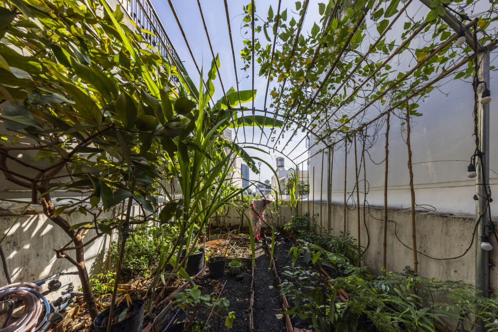 The rooftop has been transformed into an edible landscape—a plain soil garden where vegetables and fruit grow under the open sky, providing sustenance and a patch of green in the grey city. From the first-floor bedroom, views stretch to both the front and back gardens, reinforcing the feeling of living within nature rather than apart from it.