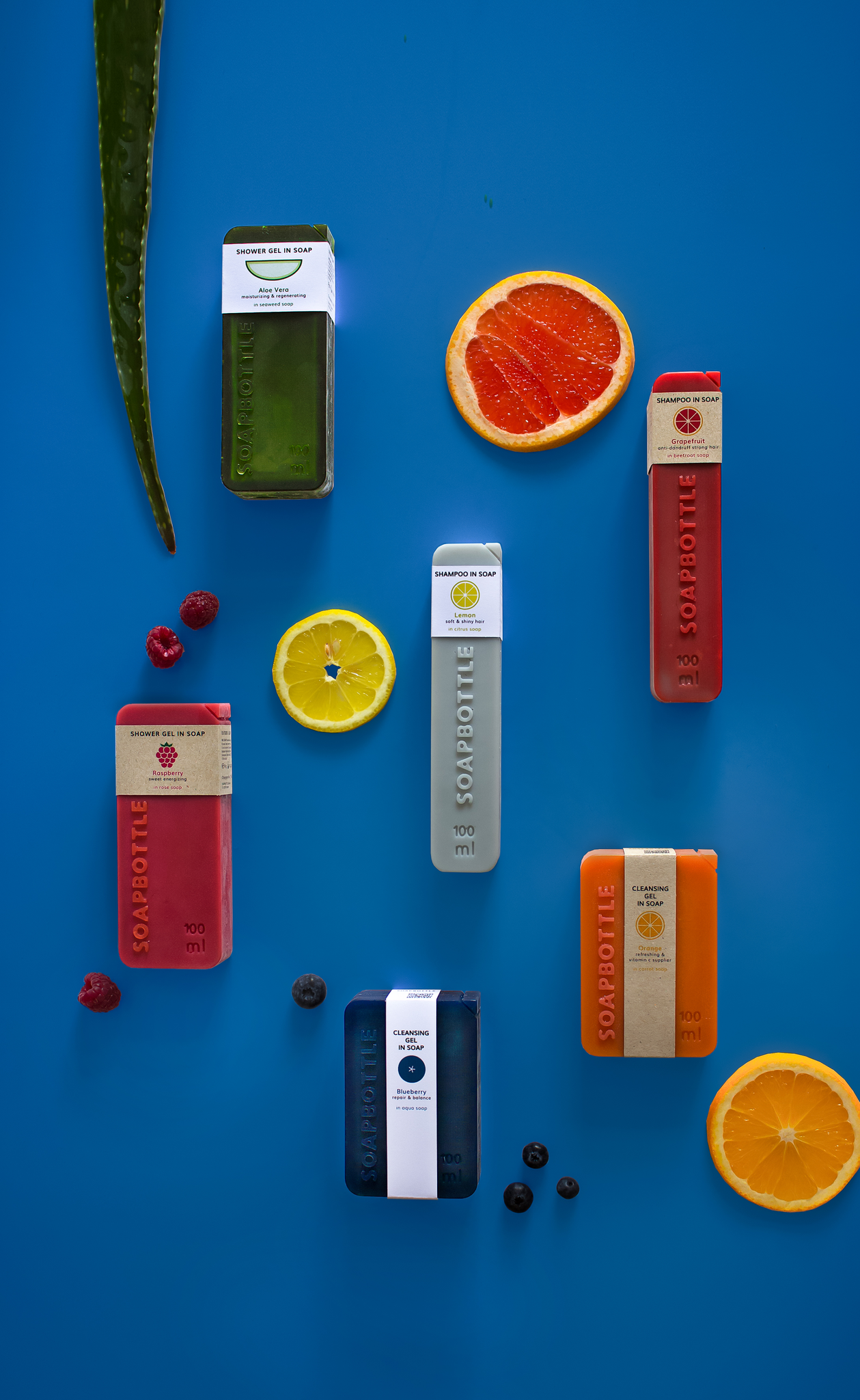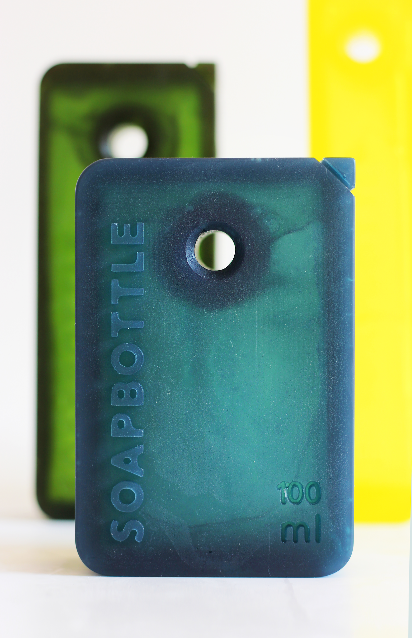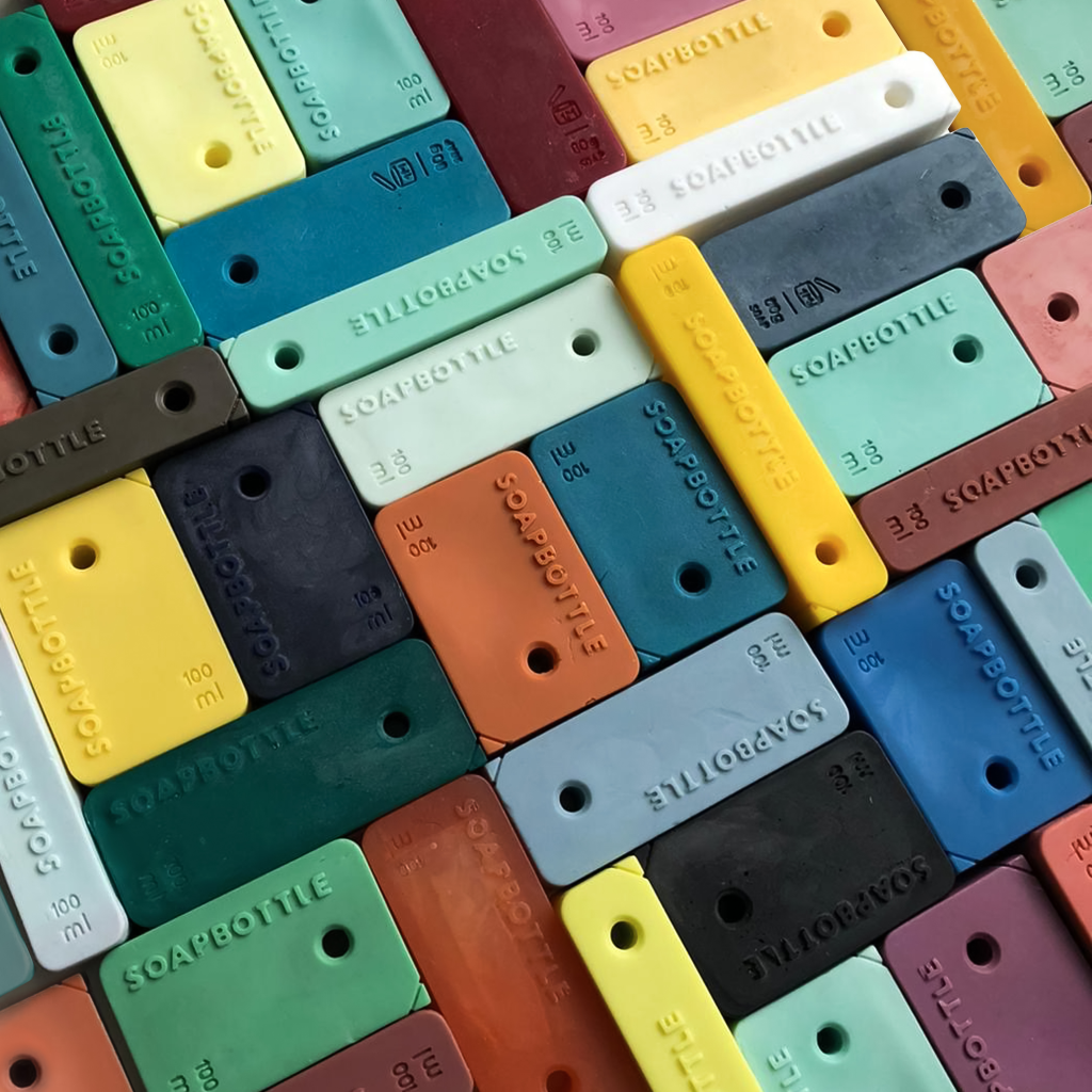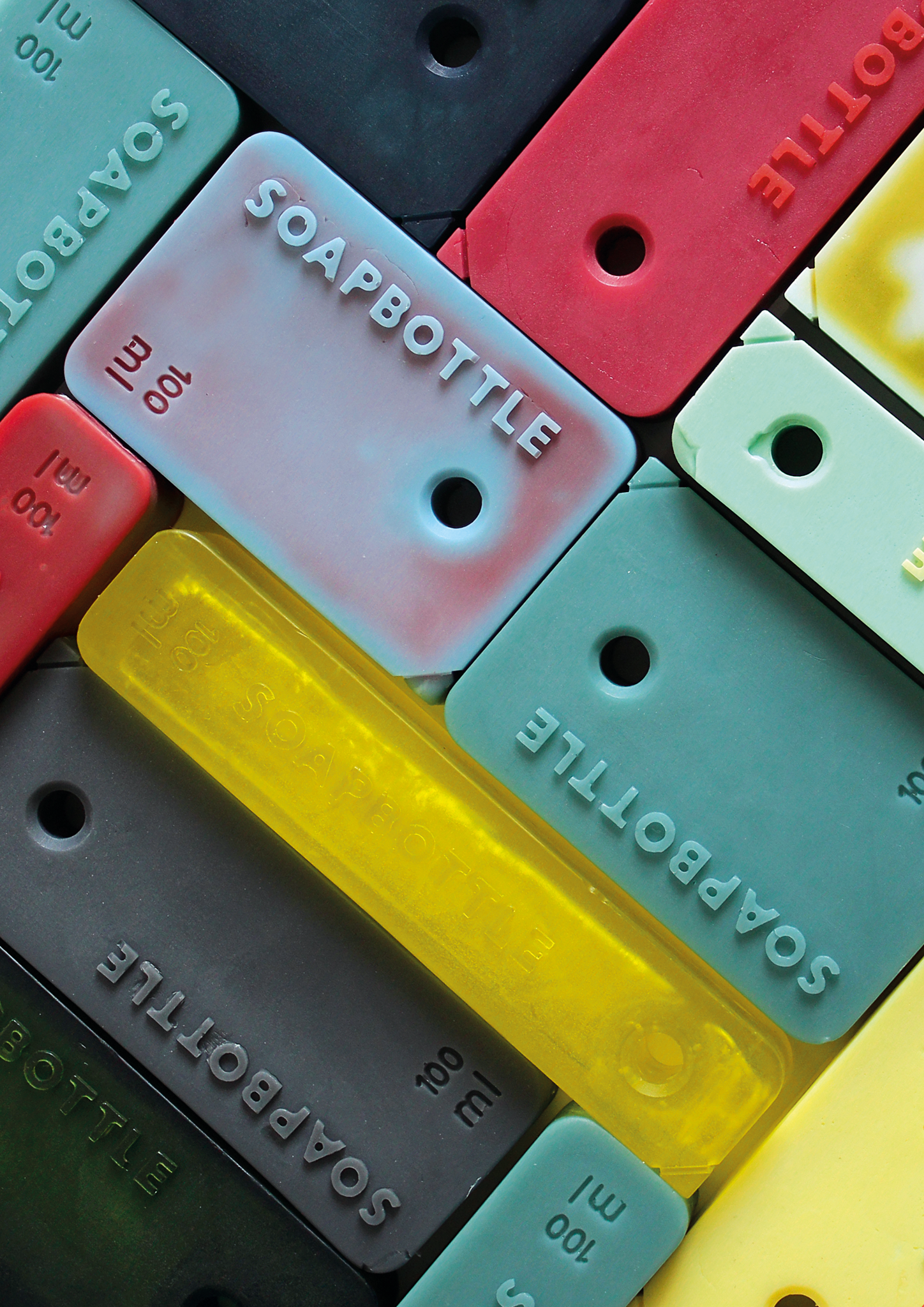 The soap for the packaging on S O A P B O T T L E is made from organic ingredients, oils, and caustic soda. While the container is used, the material washes away together with the used water. Next, it decomposes entirely into the sewage plant after a few days. There you have it, no waste.