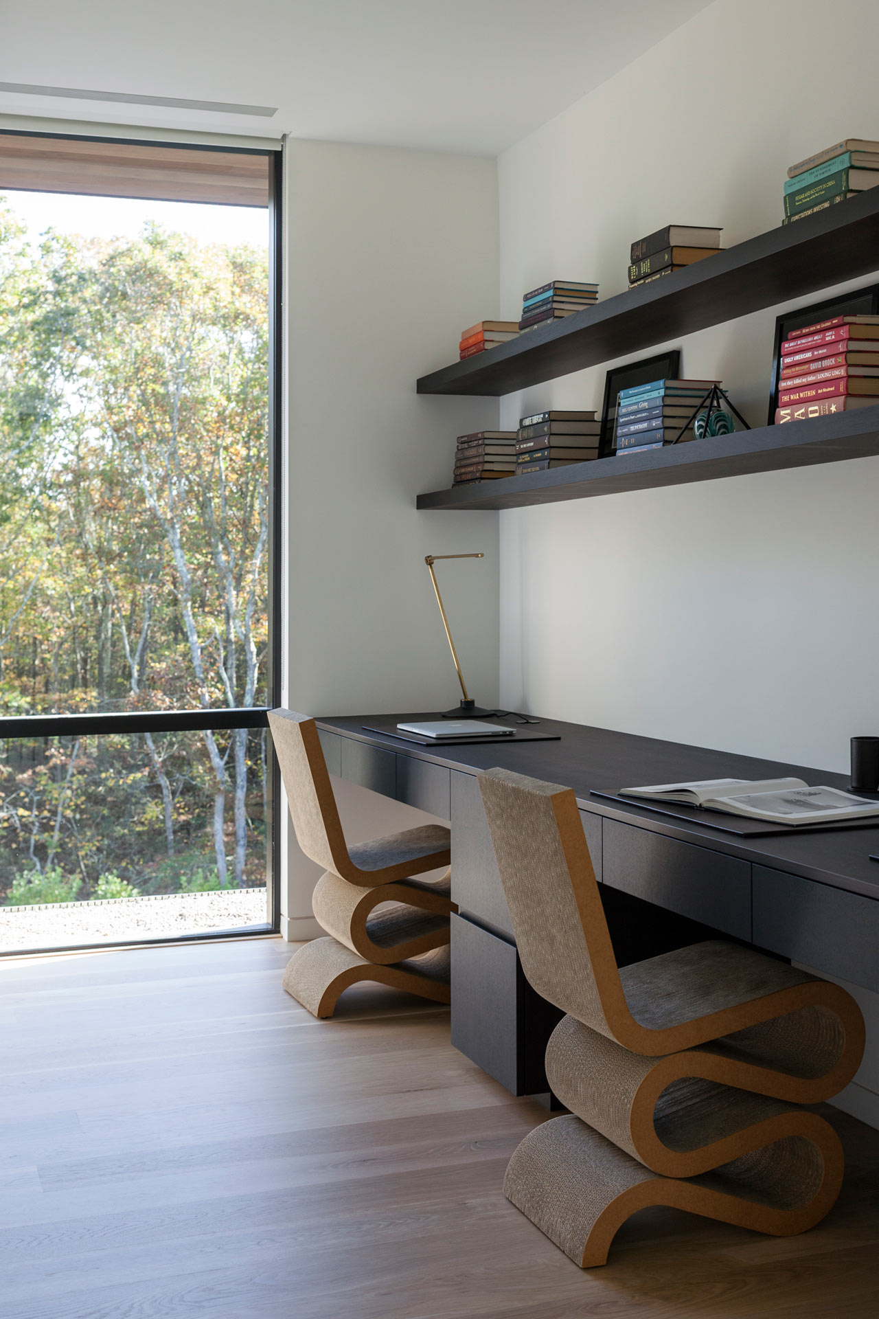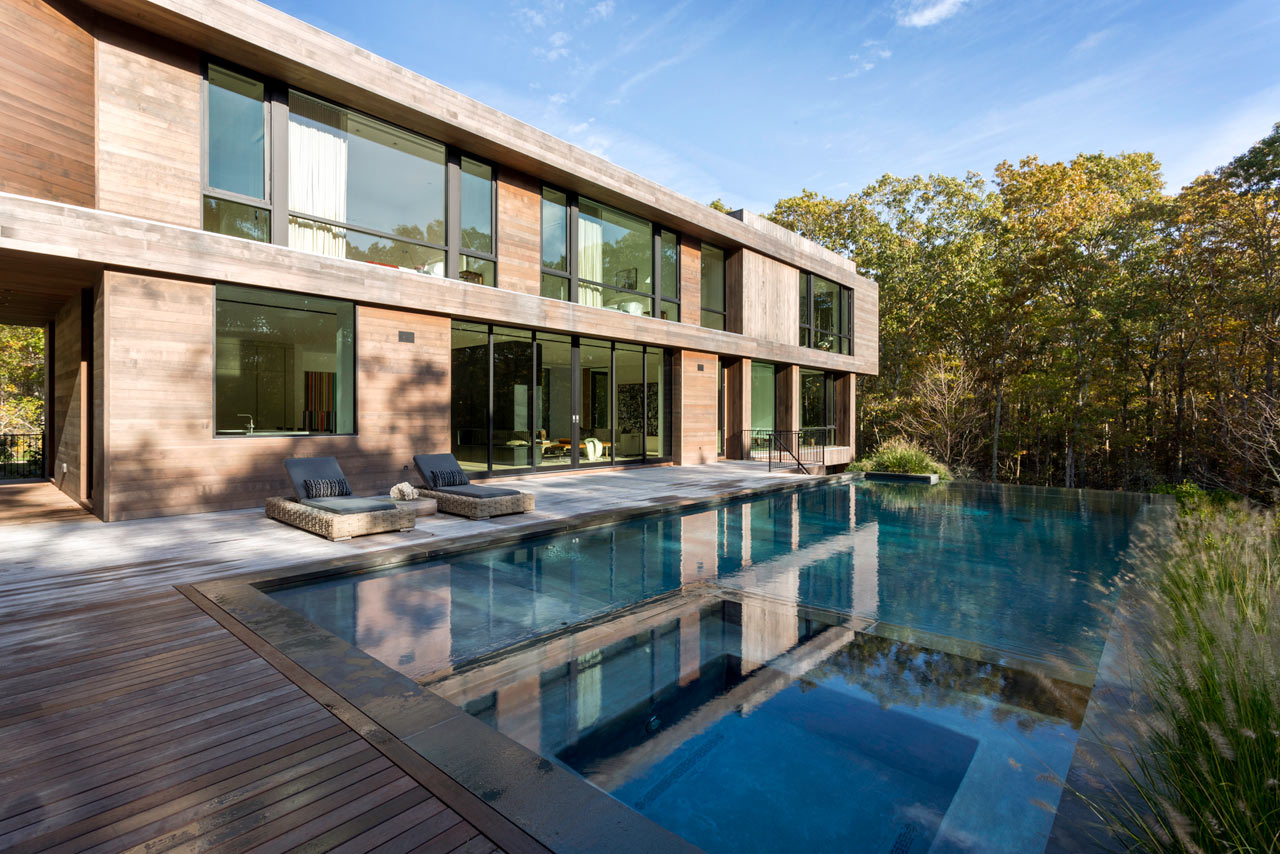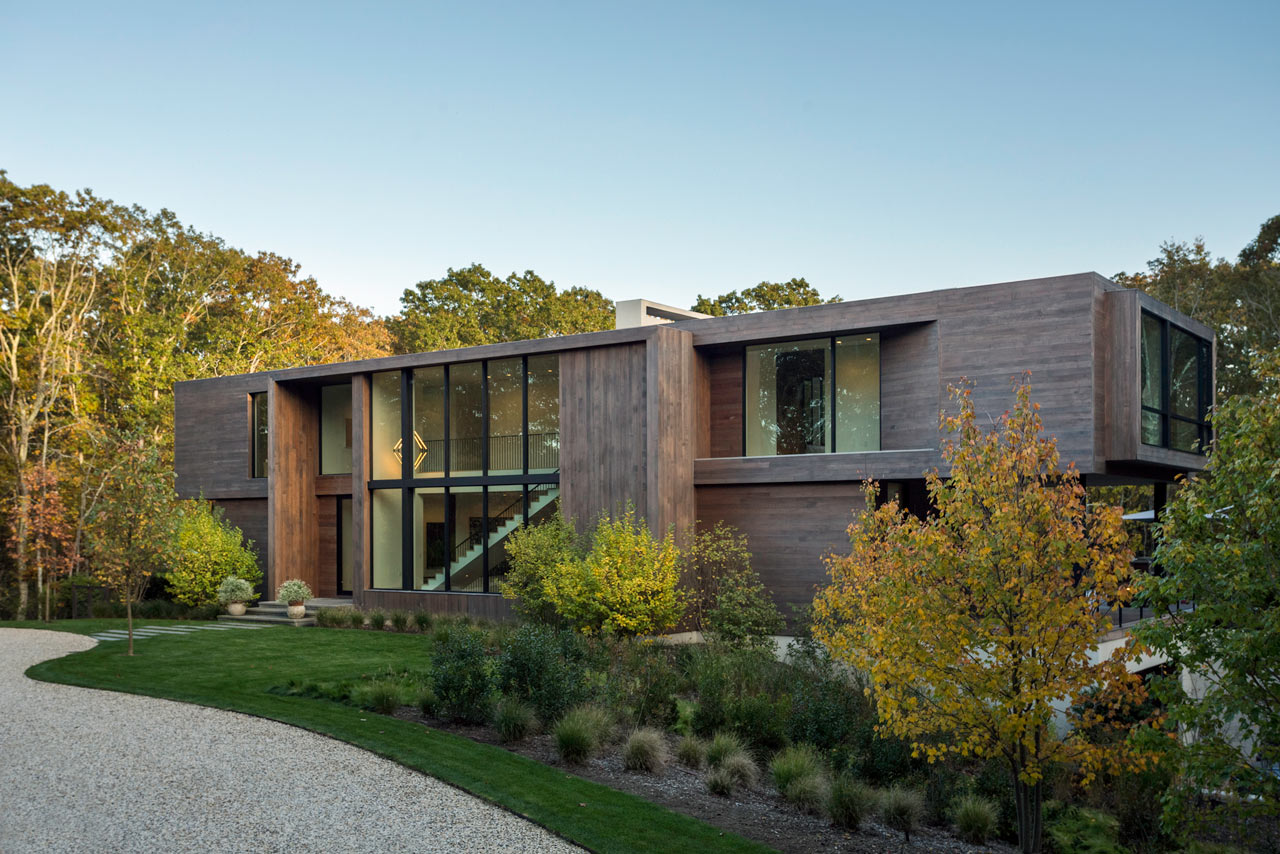 Perched atop a wooded lot the objective of the Old Sag Harbor Road Residence is to deliver seamless indoor/outdoor living and, as you can see from these excellent images, it’s mission well and truly accomplished. Measuring a rather vast 7,100-square-feet of living space, the home has actually benefited from the uneven topography of the plot, which has let the architects design a lower floor with a walk-out. The top floor then cantilevers out on either end of the linear home which adds a convertible amount of extra square footage without actually increasing the footprint of the build.