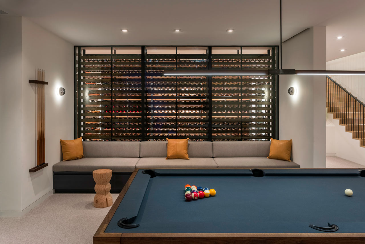 For those with a penchant for swimming, the Old Sag Harbor Road Residence from Blaze Makoid Architecture is definitely going to appeal. It has a negative edge swimming pool which is just steps from the main living area, and is connected by floor-to-ceiling sliding glass doors that disappear into the fabric of the building. This opening measures some 22.5ft so really does bring the outdoors inside and strikes the perfect balance of indoor / outdoor living. Within the main living space there is a three-sided fireplace which has been clad in blackened steel and provides a divide between the living room and dining room.