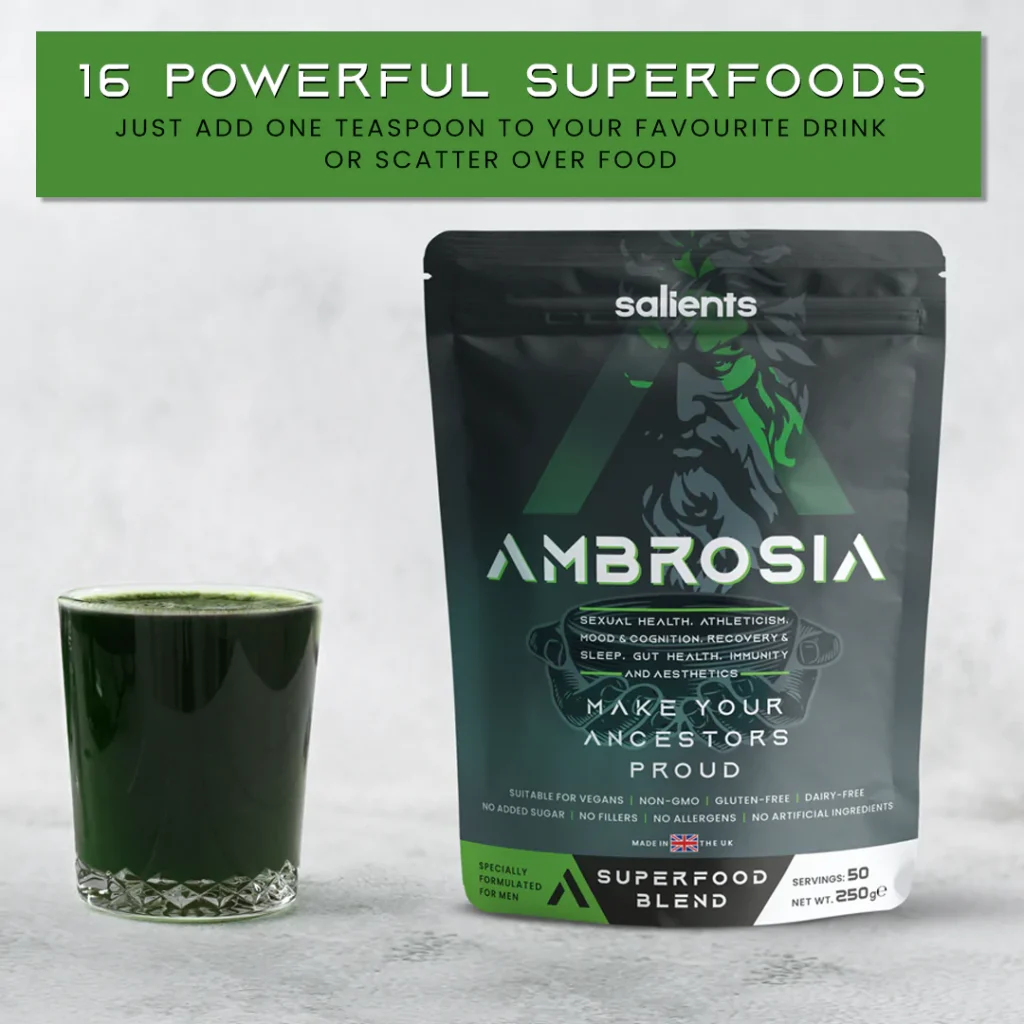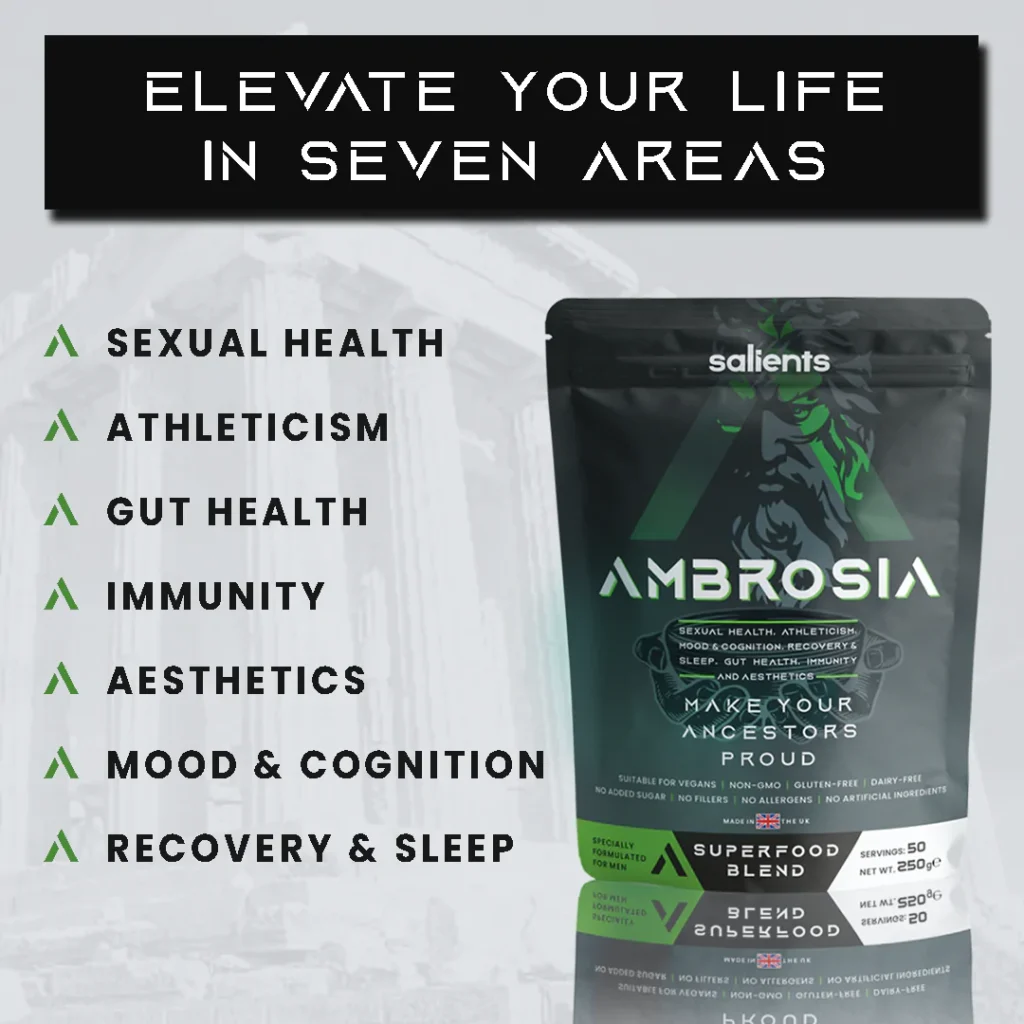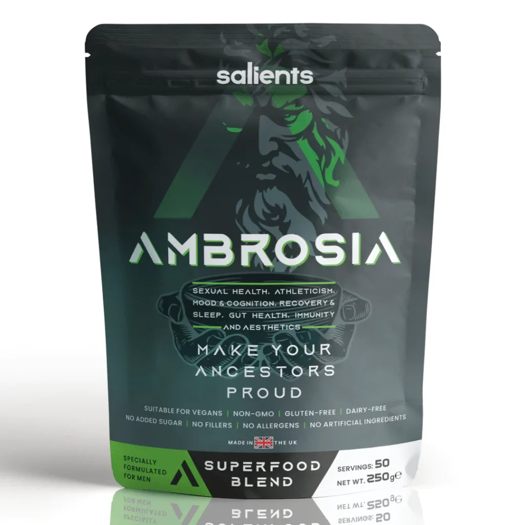 The SALIENTS Ambrosia Superfood Blend (£25) is so-named based on ancient Greek mythology where the consumption of Ambrosia was reserved for divine beings. Ambrosia is the food of the Gods which bestowed longevity, or even immortality, on whoever consumed it. It was brought to the Gods in Olympus by doves and served at the heavenly feast. This is the ethos that drives the products from SALIENTS and they are striving to make men their strongest selves in this modern world. So they chose to name their superfood Ambrosia. Seems fitting.