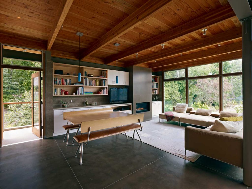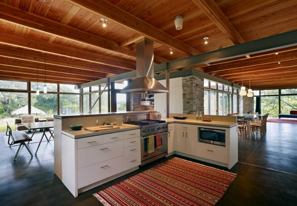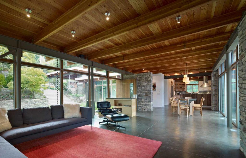Aesthetically superior on the outside, the good news just keeps on coming when you head inside San Anselmo Residence from Pfau Long Architecture. The interior feels contemporary yet cozy with its exposed structure of painted steel beams, Douglas fir panels and glulam beams, which is expertly finished off with stone work and polished concrete floors throughout.