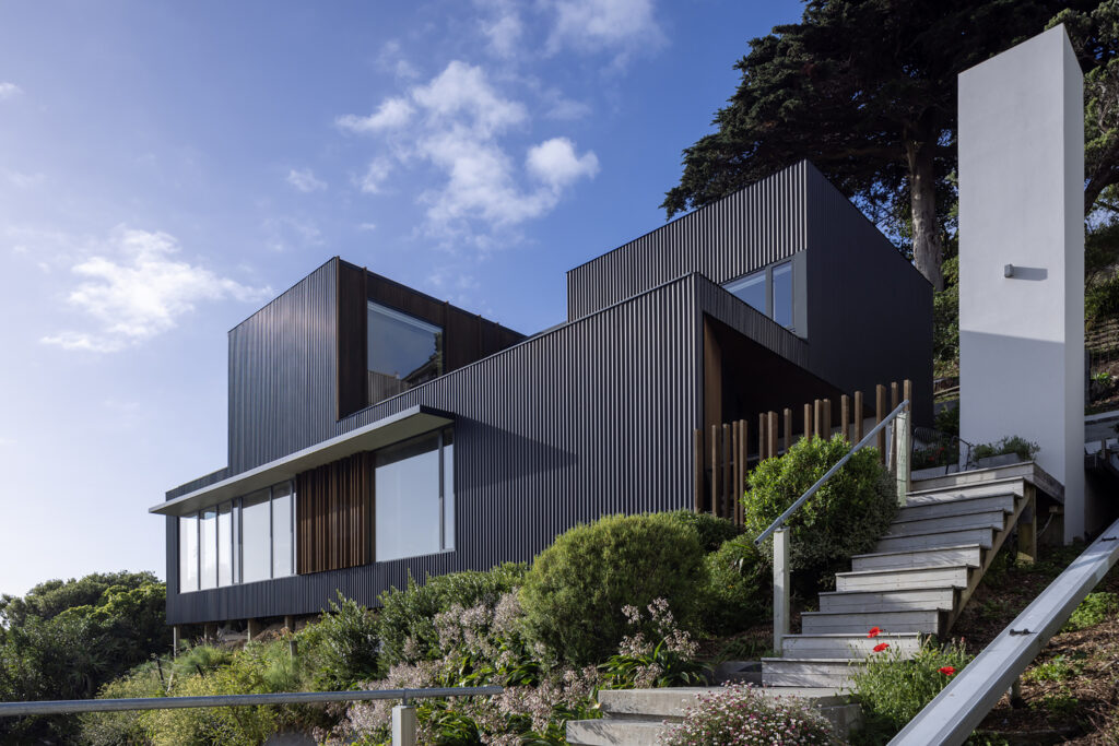 On the exterior, the house is predominantly clad in corrugated colour steel—a nod to its durability, minimal maintenance needs, and affordability. This industrial aesthetic is softened in areas where the structure is more likely to be encountered by people—such as entrances or areas where the form has been carved away—by the use of Western Red Cedar cladding. This natural wood, combined with the building’s timber-framed construction, introduces warmth and visual texture to the home’s design. Inside, a variety of timbers have been used extensively to create a warm, rich interior atmosphere—resulting in a home that is as beautiful on the inside as it is on the outside.