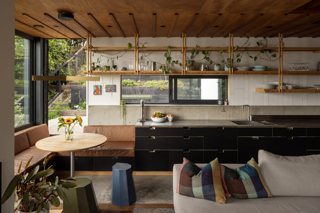 Parsonson Architects wanted Sar Street House to be not just visually appealing but also highly functional, energy-efficient, and capable of integrating into the challenging terrain without disruption. As such, the choice of materials became essential, especially given the logistical challenges of building 30 meters above the street without the use of heavy lifting equipment. Timber framing forms the primary structure of the house, with light EPS blocks used for retaining walls where needed. The architects also prioritized materials that could be left in their natural state, celebrating their patina and organic charm while minimizing upkeep.