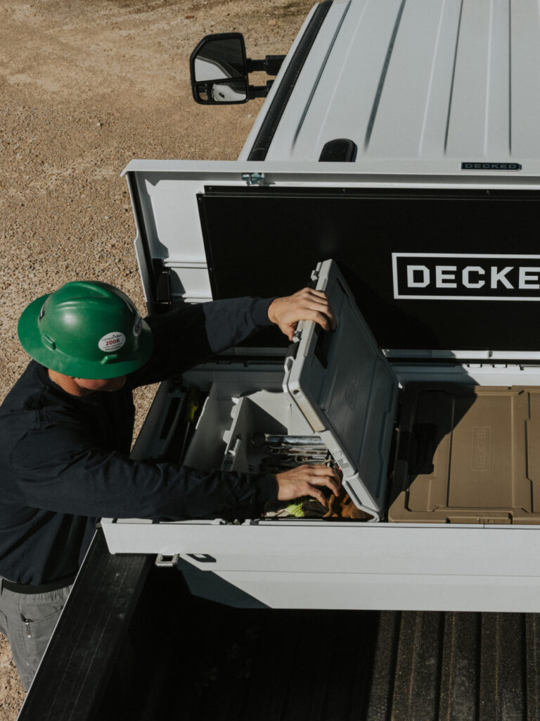 Integrated storage trays keep your daily essentials close at hand, while built-in rails are designed to perfectly hold DECKED’s weatherproof D-co Cases. You can even add Tool Hooks to hang cords and hoses completely out of the way. If you want to take your bed setup to its absolute pinnacle, the tool box is fully compatible with CargoGlide for unparalleled accessibility.