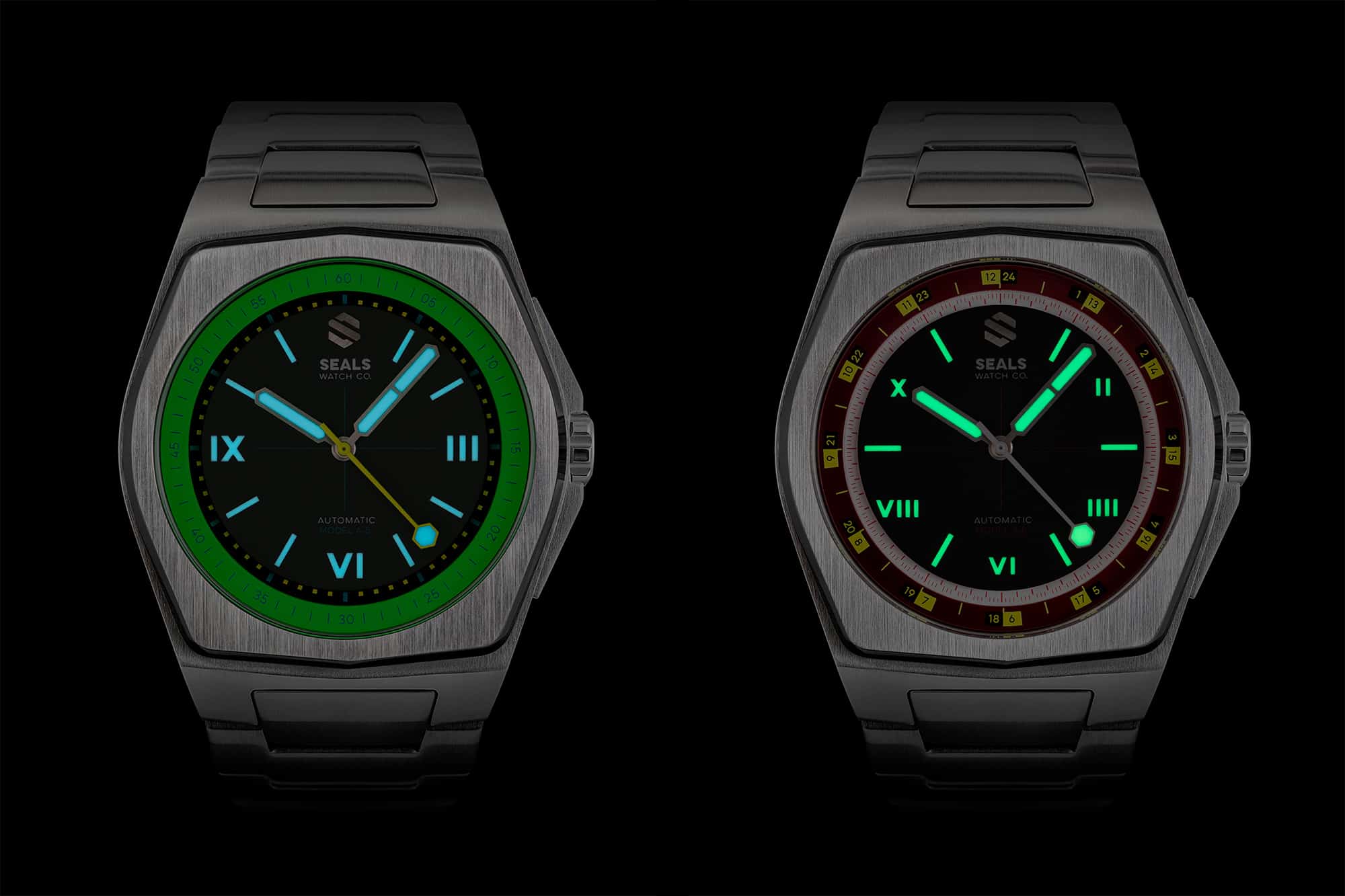 With the Burgundy Roulette version of the watch you’ll find within the patented steel sports case, Seals’ 24 hour “roulette” chapter ring which delivers that bold, vintage style flair to the Model A.5. This is expertly complimented by the red crosshair dial and C3 SuperLuminova, which makes the watch warm in tone yet visually energetic. For the Acid Green version of the A.5 you’ll find it finished with a special pigment that is much brighter than your standard neon green. You could say it’s the greenest green imaginable, and it’s not something you’re going to find elsewhere.