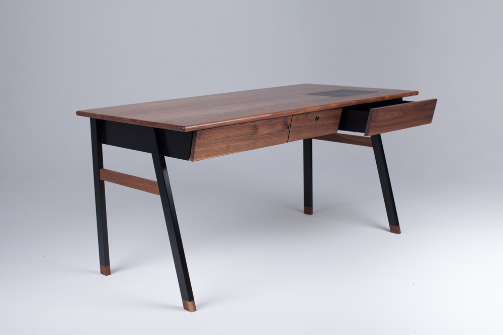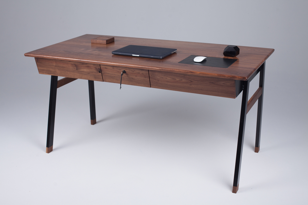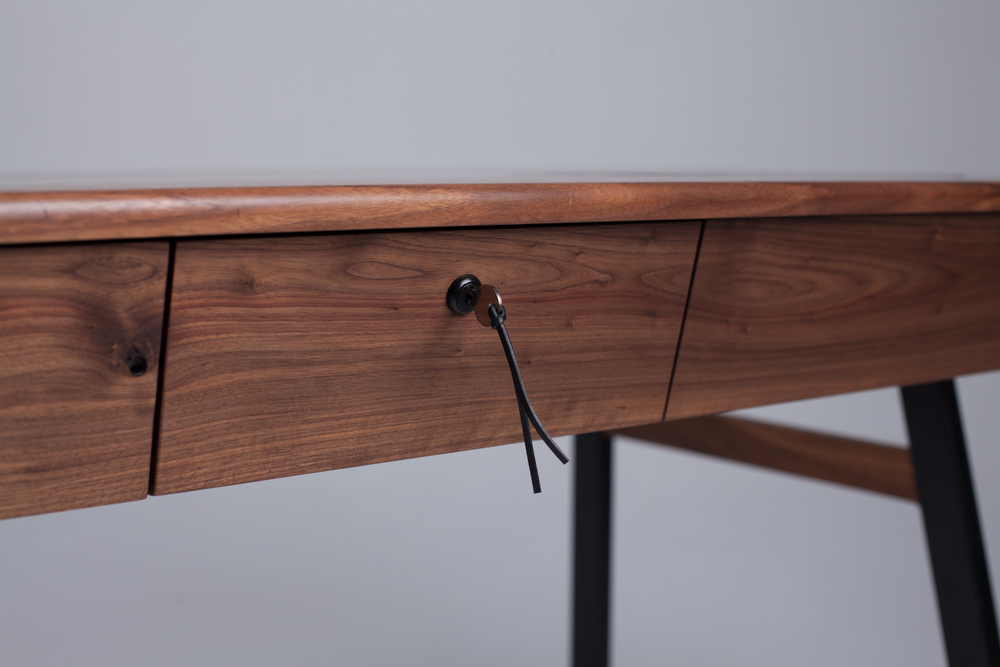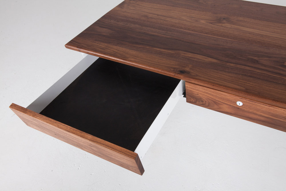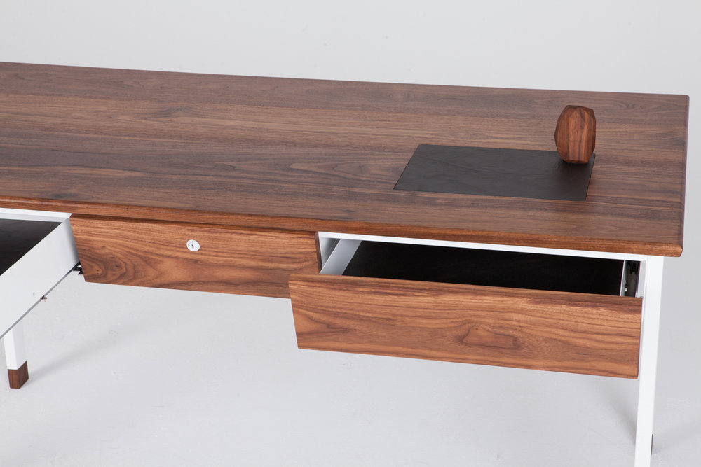 Crafted from beautiful and robust American black walnut along with a steel powder coated base, the Agent Desk from Sean Woolsey Studio is a real vision. With blum soft close drawer slides on the two drawers, striking black leather lined drawer bottoms, a lockable stow area (ideally suited for keeping your valuables such as laptop, iPad, your favorite whiskey or watch) and a built-in leather mouse pad which can only open with a strong magnetic wood geode (which is provided with the desk), and allows for perfect storage of your everyday carry, writing instruments, notepad, wires and mouse.