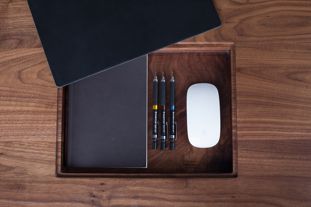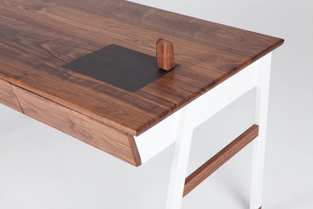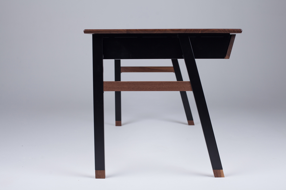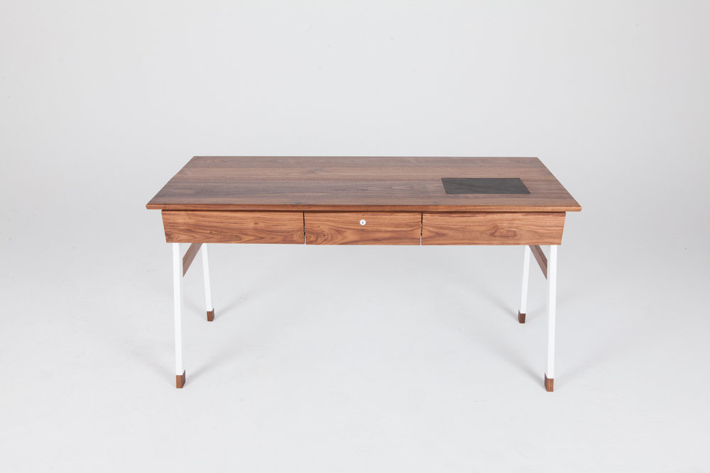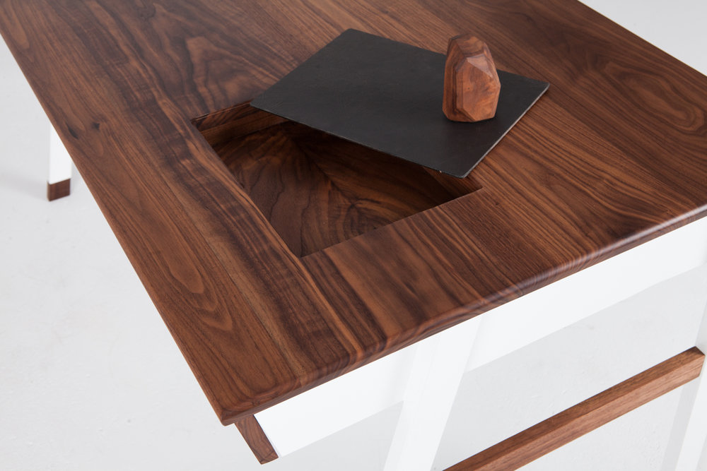 Crafted from beautiful and robust American black walnut along with a steel powder coated base, the Agent Desk from Sean Woolsey Studio is a real vision. With blum soft close drawer slides on the two drawers, striking black leather lined drawer bottoms, a lockable stow area (ideally suited for keeping your valuables such as laptop, iPad, your favorite whiskey or watch) and a built-in leather mouse pad which can only open with a strong magnetic wood geode (which is provided with the desk), and allows for perfect storage of your everyday carry, writing instruments, notepad, wires and mouse.